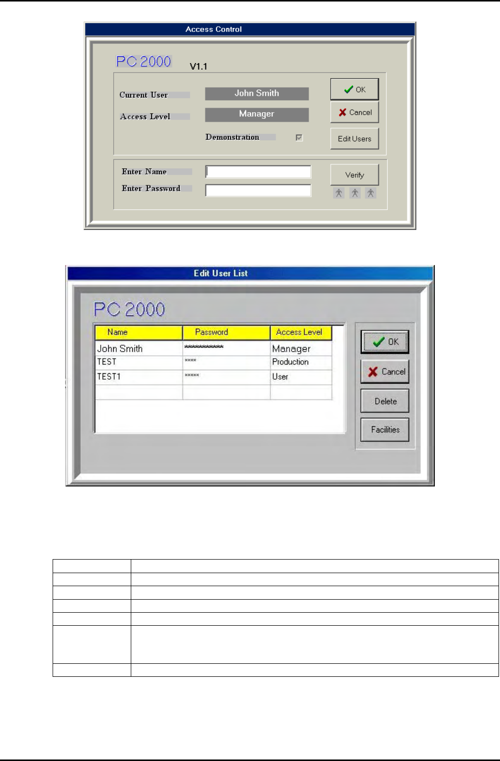 Similarly, existing Names, Passwords and Access Levels can be edited. In addition,