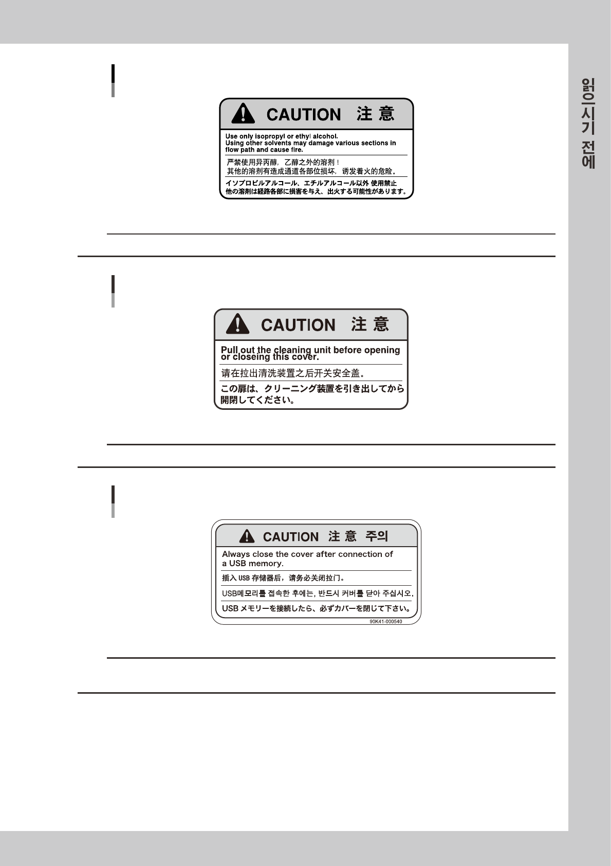 이라벨이붙어있는커버를개폐할경우에는 ,먼저클리닝장치를인출해주십시오 .반대로하면커버가손상될우려가있습니다 .