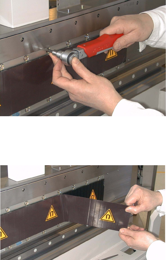 1 Serviceanleitung Linearmotor Sekundärteil SIPLAC E HS-50 Linearmotor Sekundärteil HS-50 1.3 Umbau Magnete mit Abdeckblech Ausgabe 02/2009 10 : Klipsen Sie die Auflage schienen auf die Bo hr ungen der Schraub en der Mag…