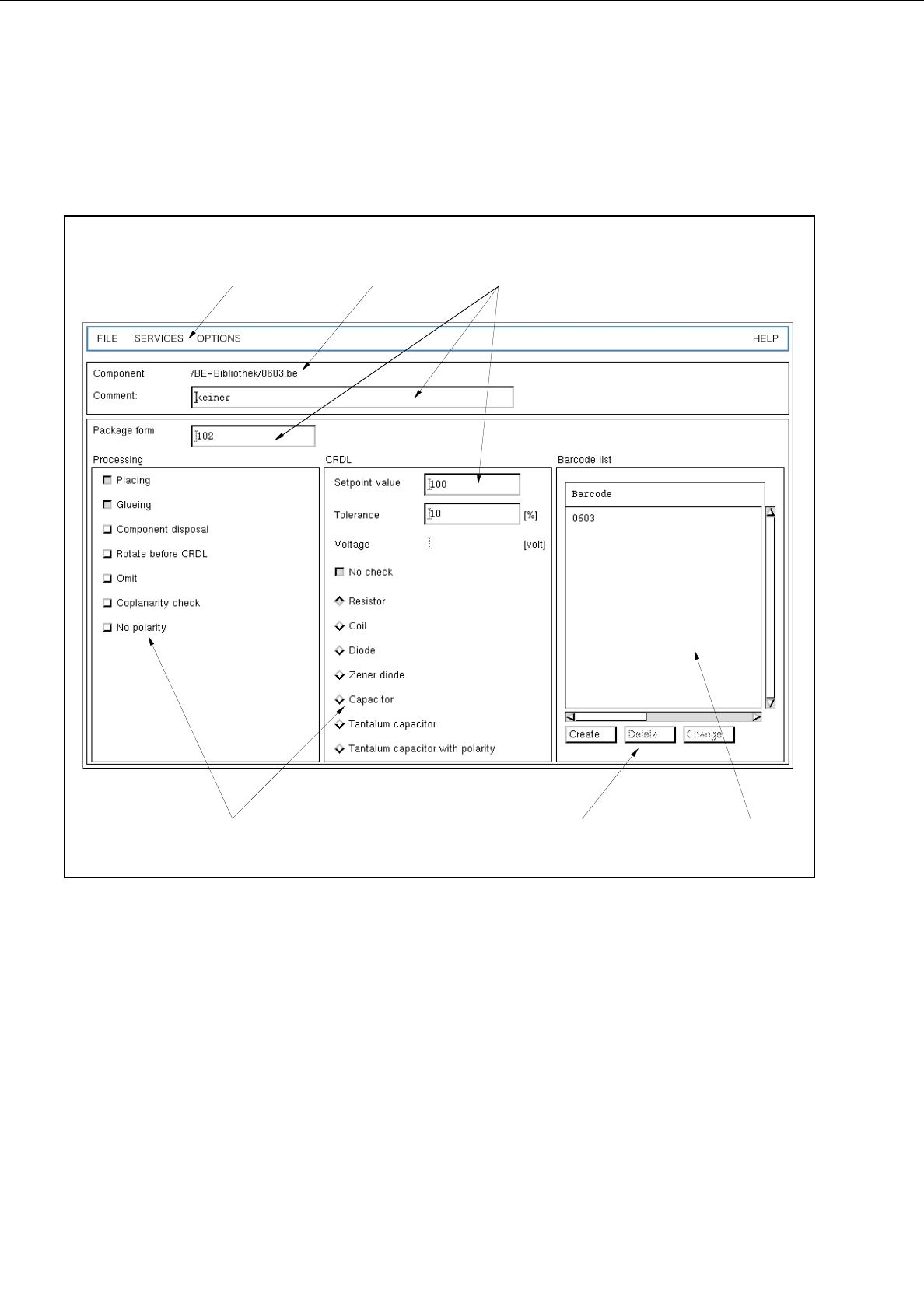 The selection field "CRDL" (right portion of the main window) serves to define the type of a particular component