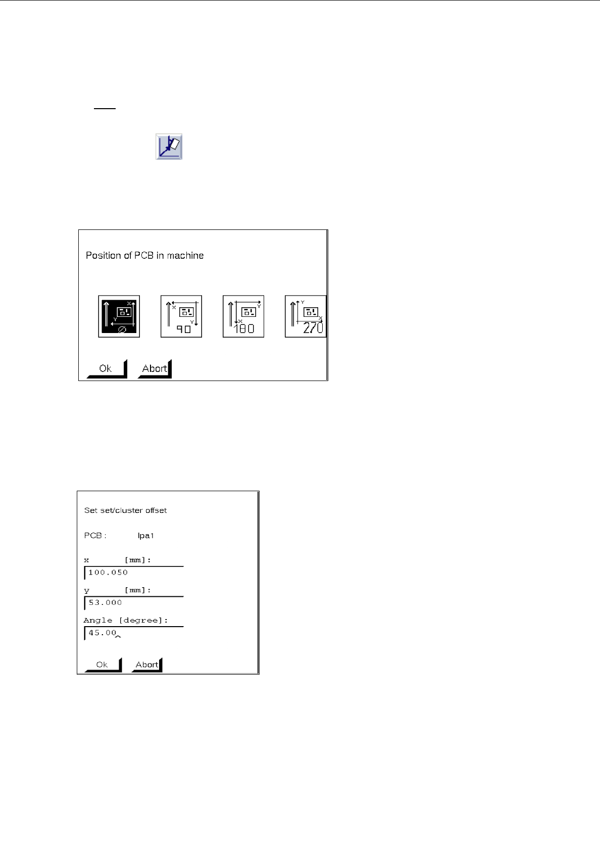 Enter x, y-coordinates and angle with respect to partial PCB structure (cluster) in which the selec-