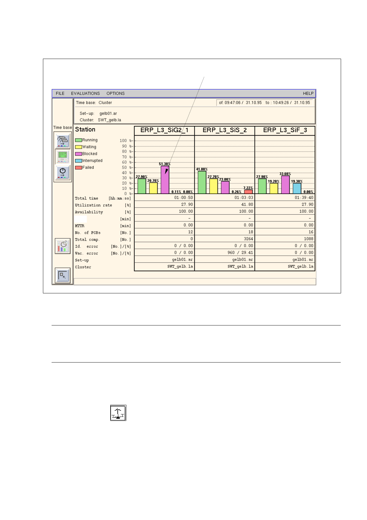 The "System Diagram" evaluation depicts the time percentages of the various states of the individual stations