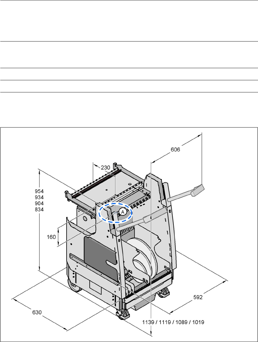 Betriebsanleitung SIPLACE HF-Serie 6 BE-Handling Softwareversion SR.505.xx Ausgabe 05/2004 DE 6.3 BE-Wagen 263 6 6.3.3 Abmessungen und Schwerpunkt 6 Abb. 6.3 - 4 A bmessungen, alle Maße im Millimeter Der Schw erpunkt (A)…