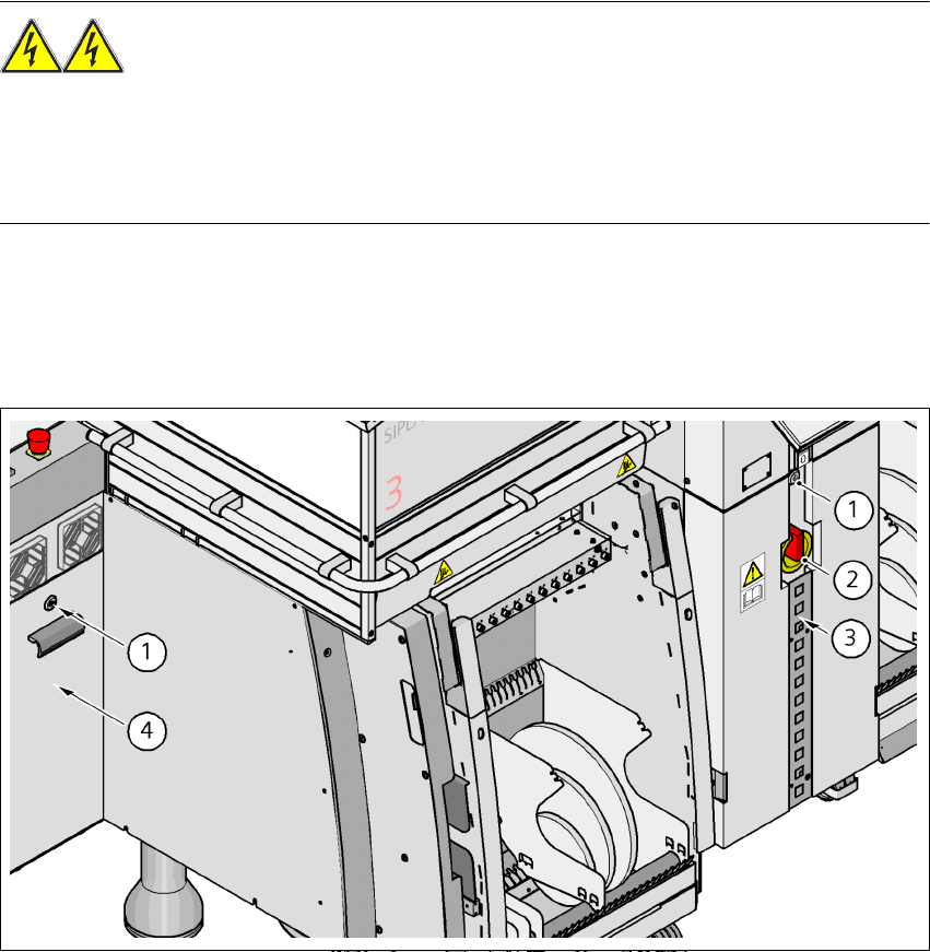 Æ Nur qualifiziertes bzw. geschultes Personal darf die Abdeckung über dem Stromversorgungs-