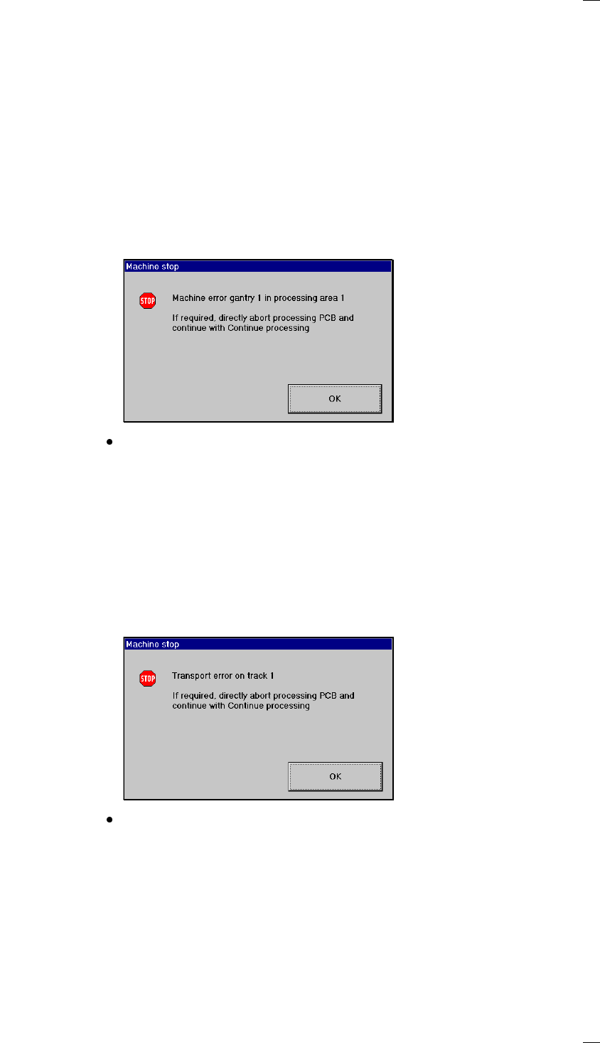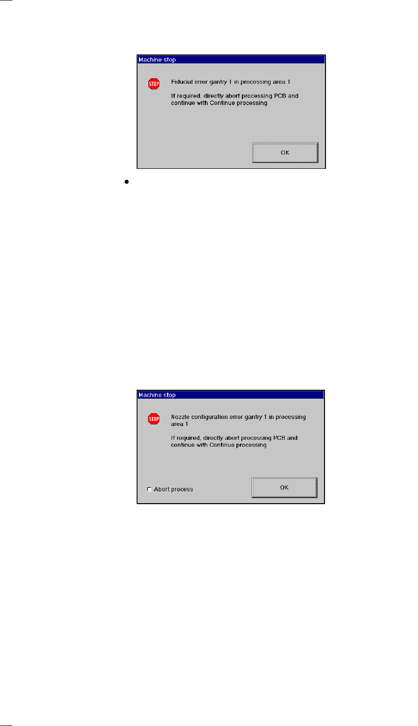 48 Fiducial errors This error me ssage wi ll be displayed if it was not possible to fin d or detect a fiducial. Click on OK to ackn owledge and then sele ct from the fun ctions display ed: Abort proces s. PCB With this f…