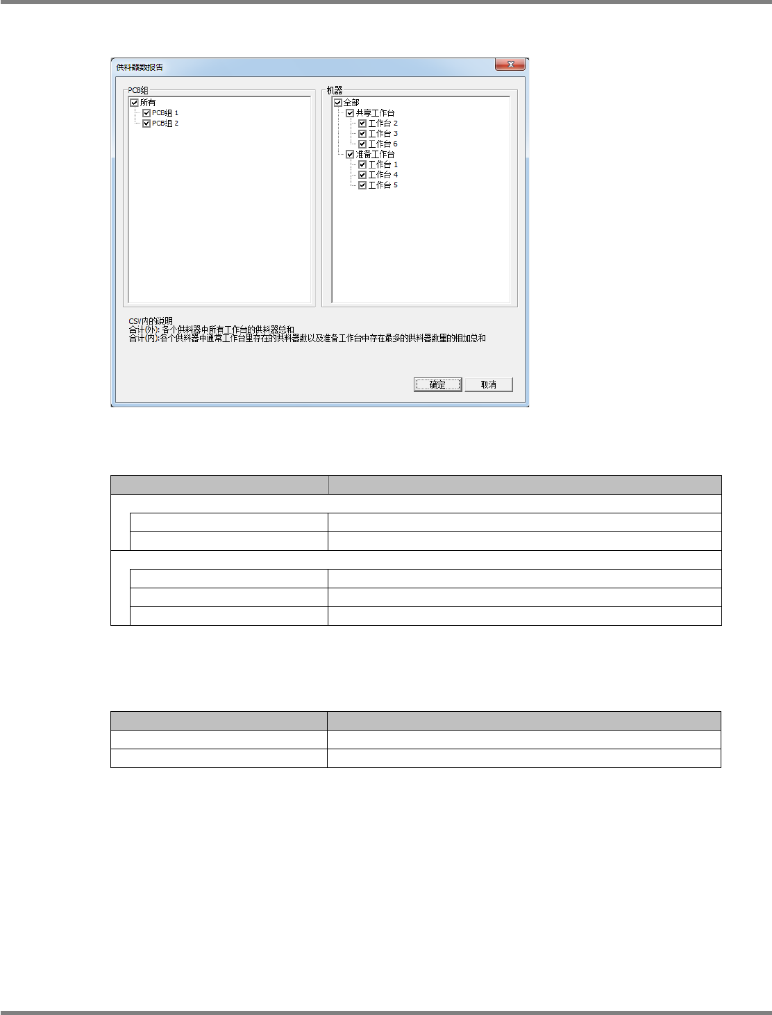 NPM-DGS 程序手册 7.2 项目编辑系统主画面 EJS9AC-MB-07P-35 Page 7-77 1 择 [ 文件 ] [ 供料器数报告 ] 。 将显示 < 供料器数报告 > 画面。 2 勾选从 [PCB 组 ] 输出的 PCB 组。 3 勾选从 [ 机器 ] 输出的工作台。 将对工作台实施如下所示的分组。 共享工作台 : 设为 [ 共享使用 ] 的工 作台 准备工作台 : 设为 [ 准备供料器 ] 的…