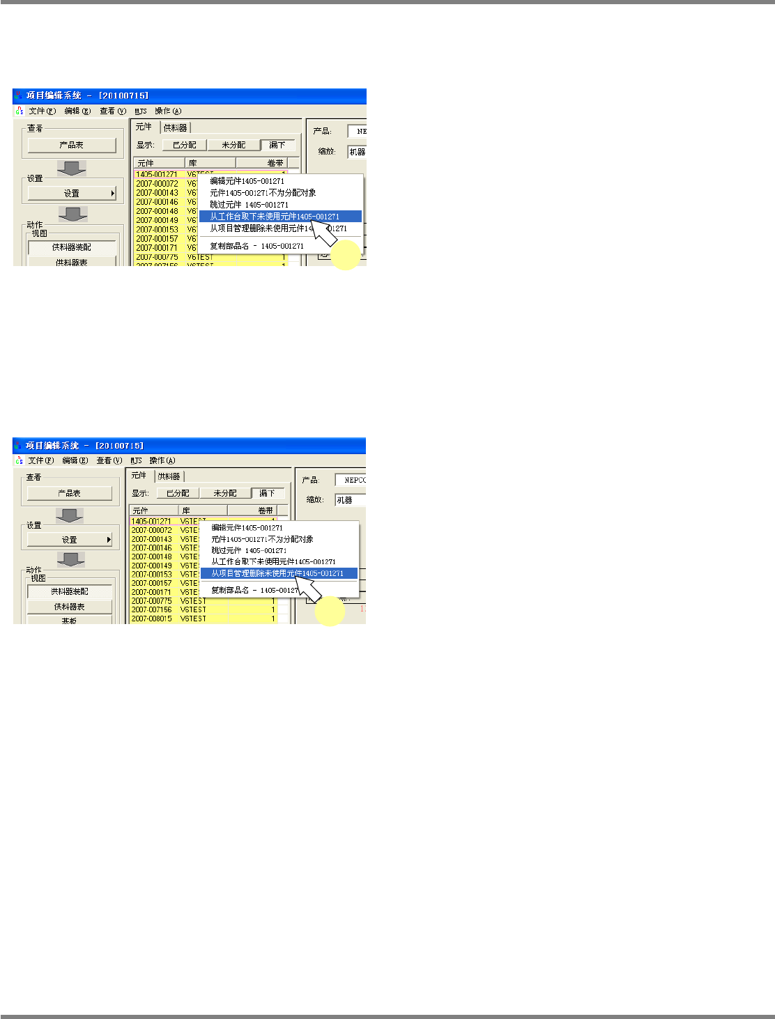 使用这项功能,能够将配置在供料器上的全部未使用元件都从供料器上取下来,并从项目管理的一
