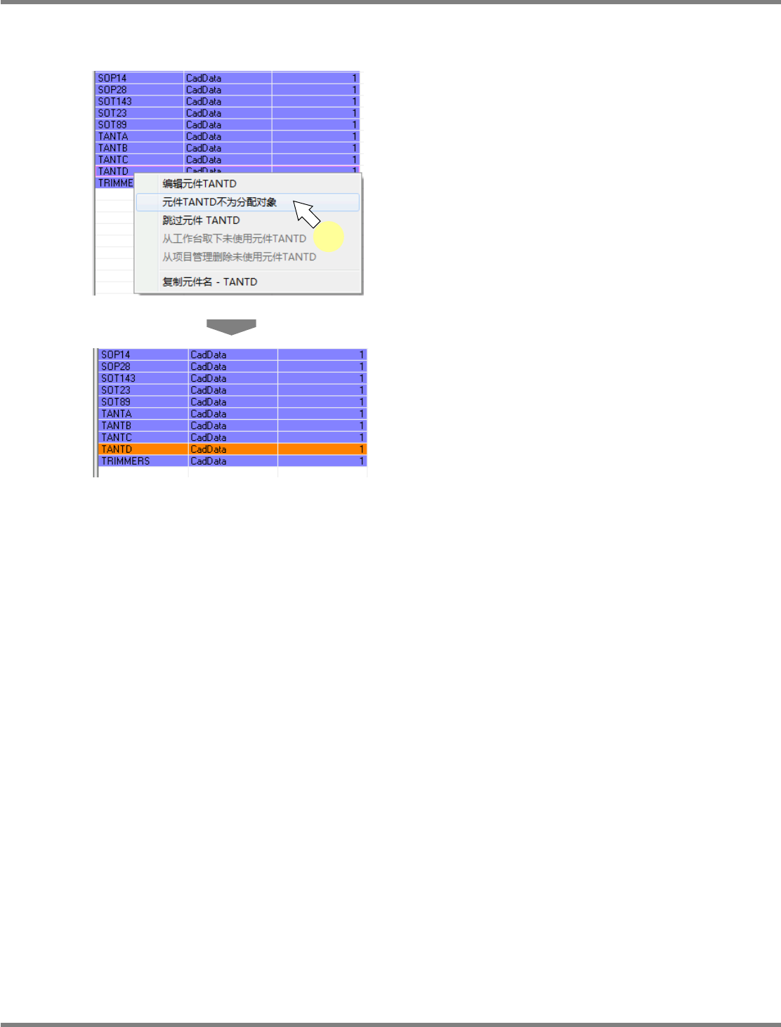 NPM-DGS 程序手册 7.4 供料器装配画面 EJS9AC-MB-07P-35 Page 7-129 元件的分配对象外设定 1 在未配置的元件上右击。 2 选择右击菜单的 [ 元件 XXXX 不为分配 对象 ] 。 元件的背景颜色转为橘黄色 ( 分配对象外 ) 。 Product070300S- 26C01 Product070300S- 25C01 2
