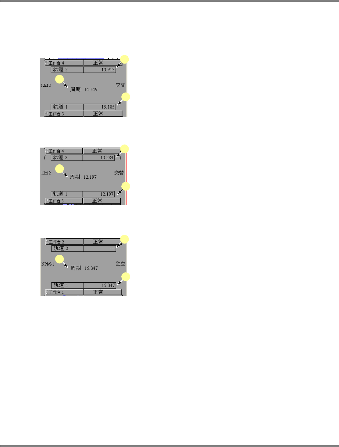 NPM-DGS 程序手册 7.4 供料器装配画面 Page 7-136 EJS9AC-MB-07P-35 在双轨上显示周期 在双轨上,显示每个轨道的周期,以 及每个机器的周期。 显示方法因实装模式、轨道指定而有 所不同。 ① 交替 : 没有指定轨道时 a : 显示各个轨道上的周期。 b : 在两个轨道上生产时,将作为机器周 期而显 示周期的平均。 ② 交替 : 指定了轨道 1 、轨道 2 时 a : 显示各个轨道的周期。没有在轨道指…