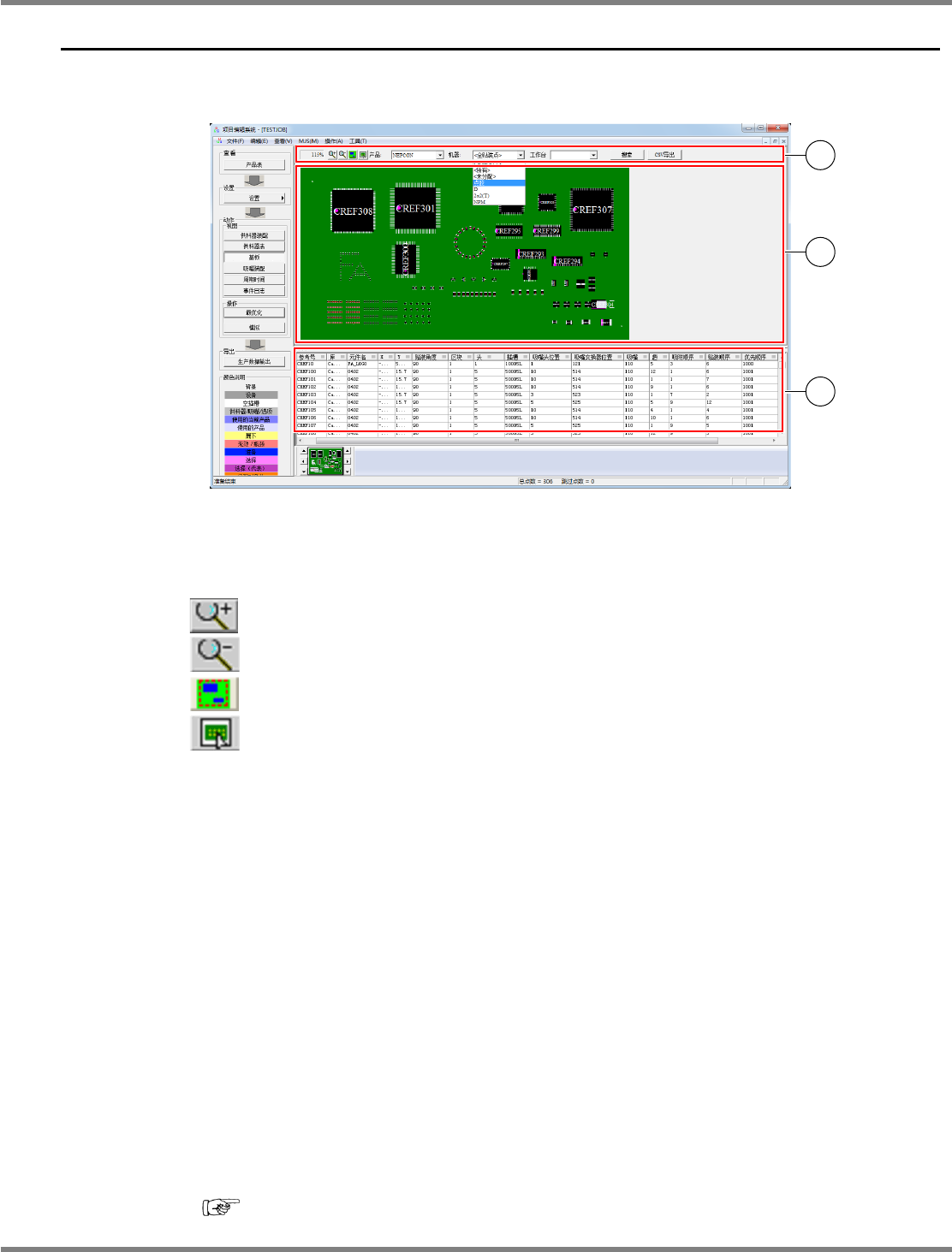NPM-DGS 程序手册 7.7 基板画面 Page 7-158 EJS9AC-MB-07P-35 ‘ 工作台 ’ 在机器选择特定机器的情况下可选择 。 [( 工作台名 )] : 只显示在所选择的工作台上进行实装 的实装点。 [ 搜索 ] 显示搜索元件的画面。 [ C S V 导出 ] 以 CSV 形式文件输出贴装点一览。
