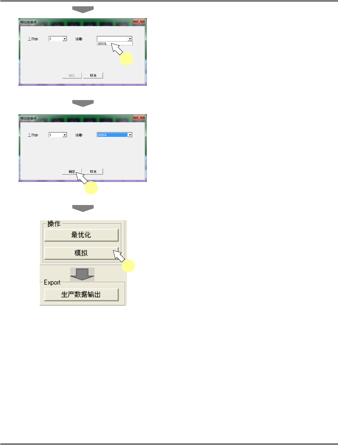 NPM-DGS 程序手册 7.7 基板画面 Page 7-180 EJS9AC-MB-07P-35 4 通过下拉菜单指定 ‘ 插槽 ’ 。 当不存在配置了相同元件的插槽时, 无法指定 插槽。 5 点击 [ 确定 ] 。 如果在插槽处于空白状态时点击 [ 确定 ] , 将在移 动处的空插槽上配置最小的序号。 6 点击 [ 模拟 ] 。 执行最优化,即会重新分配所移动的 贴装点, 而所设定的贴装点将会返回到原状。 请不要执 行最…