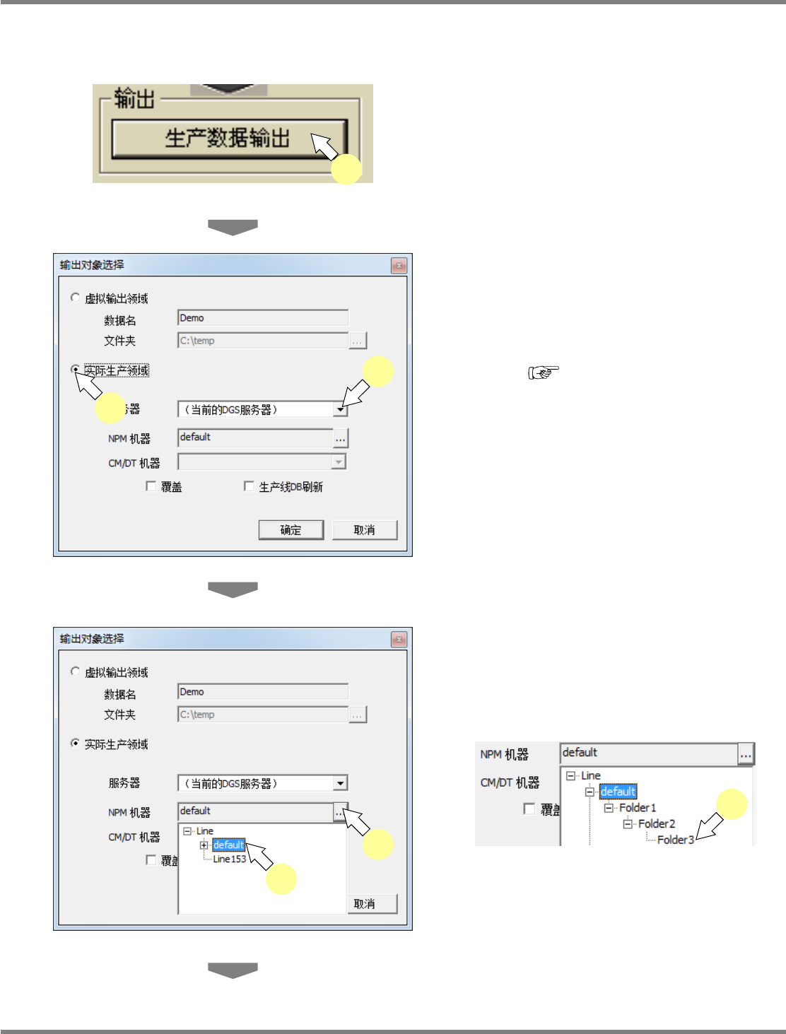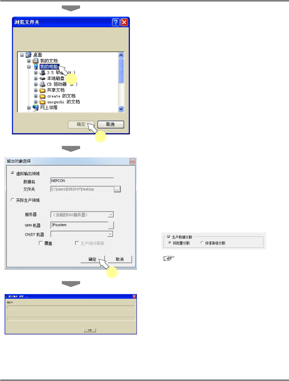 NPM-DGS 程序手册 7.12 生成数据 Page 7-226 EJS9AC-MB-07P-35 3 指定文件夹后,点击 [ 确定 ] 。 显示出所选择的文件夹。 4 点击 [ 确定 ] 。 显示出进展画面,并在指定的文件夹 中显示生 产数据。 在环境设定画面下设定了 ‘ 按批量分割 ’ 时,生 产数据将为 “ 数据编制项目名 _ 批量名 ”; 设为了 ‘ 按准备组分割 ’ 时,生产数据将按照 “ 数据编制 项目名 _ …