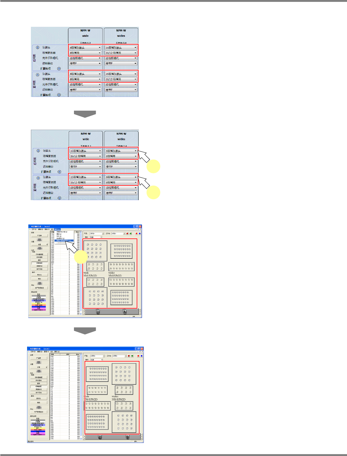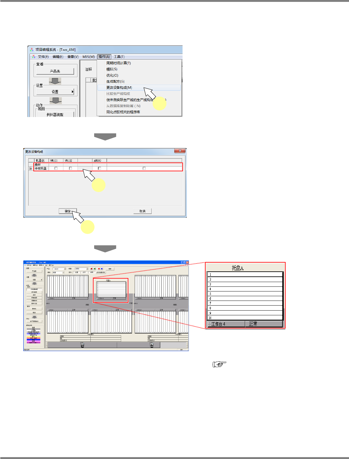 NPM-DGS 程序手册 7.12 生成数据 EJS9AC-MB-07P-35 Page 7-233 7.12.6 设备构成的变更 变更生产数据中的设备构成。 在项目编辑系统,只进行 AM100/VM101/VM102 的手动托盘的设定。 1 选择菜单栏的 [ 操作 ] [ 更改设备构 成 ] 。 显示 < 更改设备构成 > 画面。 只限生产线构成有 AM100 /VM101 /VM102 时 可以选择。 2 在…
