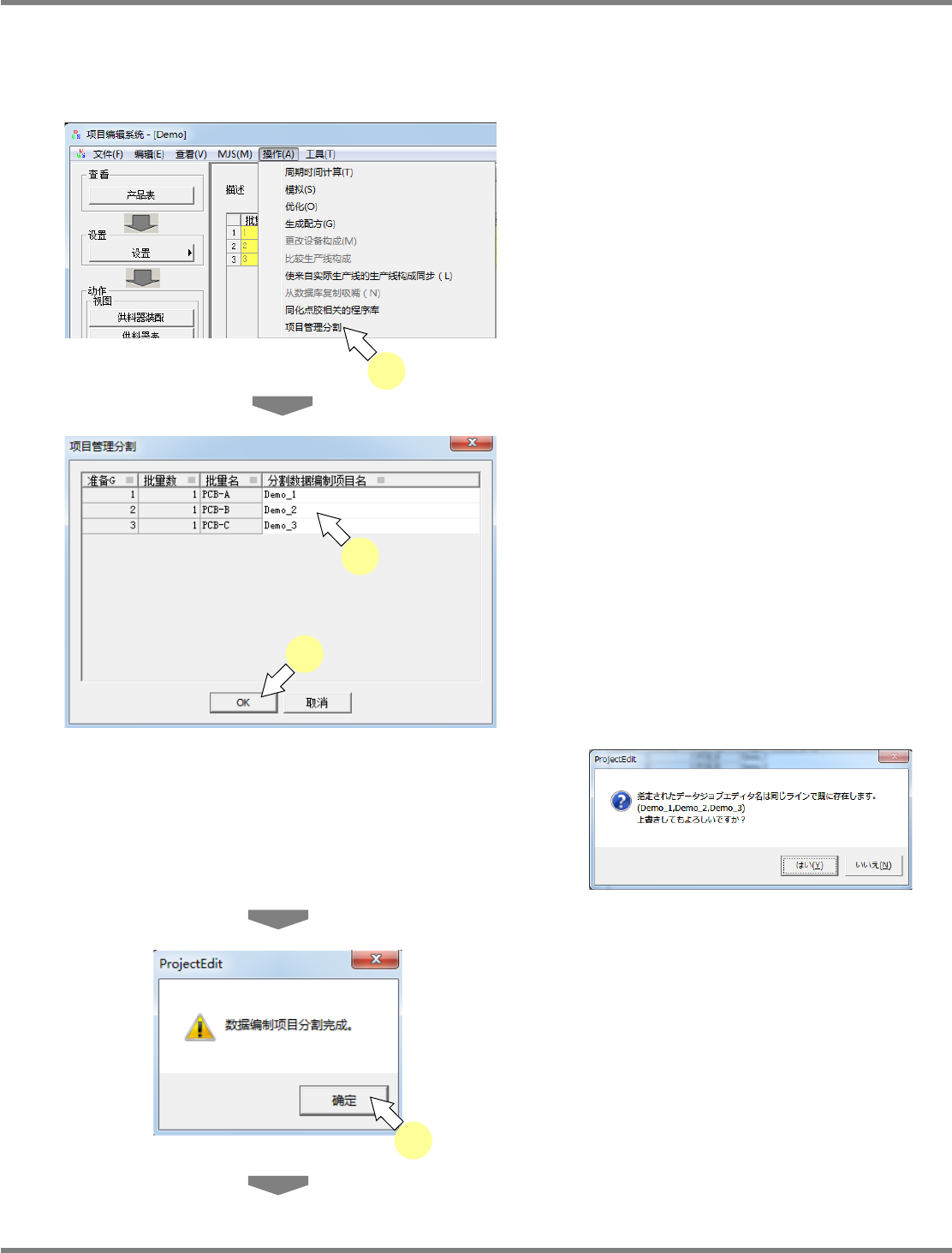 NPM-DGS 程序手册 7.12 生成数据 EJS9AC-MB-07P-35 Page 7-235 7.12.8 项目管理分割 按照在项目中设定了数据编制项目的 每个准备组编号进行分割, 然后登录进数据编制项目中。 分割 后的数据编制项目,能够以任意项目 名新建,或者覆盖既存项目后更 新。 1 选择菜单栏的 [ 操作 ] → [ 项目管理分 割 ] 。 将显示 < 项目管理分割 > 画面。 2 输入分割数据编制项目名。…