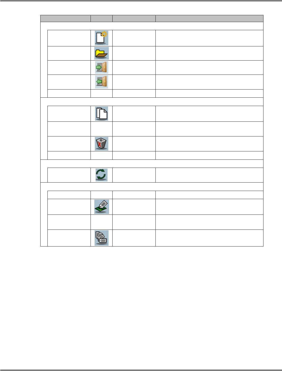 NPM-DGS 程序手册 7.1 概要 Page 7-4 EJS9AC-MB-07P-35 菜单 菜单栏 工具栏 右击菜单 说明 [ 文件 ] [ 新建 ] [ 新建 ] 新建数据编制项目。 [ 打开 ] [ 打开 ] 打开选择的数据编制项目。 [ 导入 ] [ 导入 ] 导入数据编制项目。 [ 导出 ] [ 导出 ] 导出所选择的数据编制项目。 [ 退出 ] 退出。 [ 编辑 ] [ 复制到相同生产 线 ] [ 复制到相同…