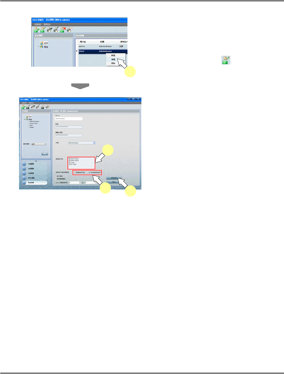 NPM-DGS 程序手册 8.1 许可证管理 EJS9AC-MB-08P-11 Page 8-15 可参照实际生产线的更改 1 从用户一览中选择已登录的用户, 然后 选择右击菜单上的 [ 编辑 ] 。 用户的更改还可通过以下的操作进行 。 ・ 菜单栏的 [ 文件 ] [ 用户更改 ] ・ 点击用户更改图标 ・ 选择用户后双击 2 从 ‘ 实际生产线的参照号 ’ 中选择 ‘ 所有的 生产线 ’ 或 ‘ 仅为选中的生产线 ’ 。…
