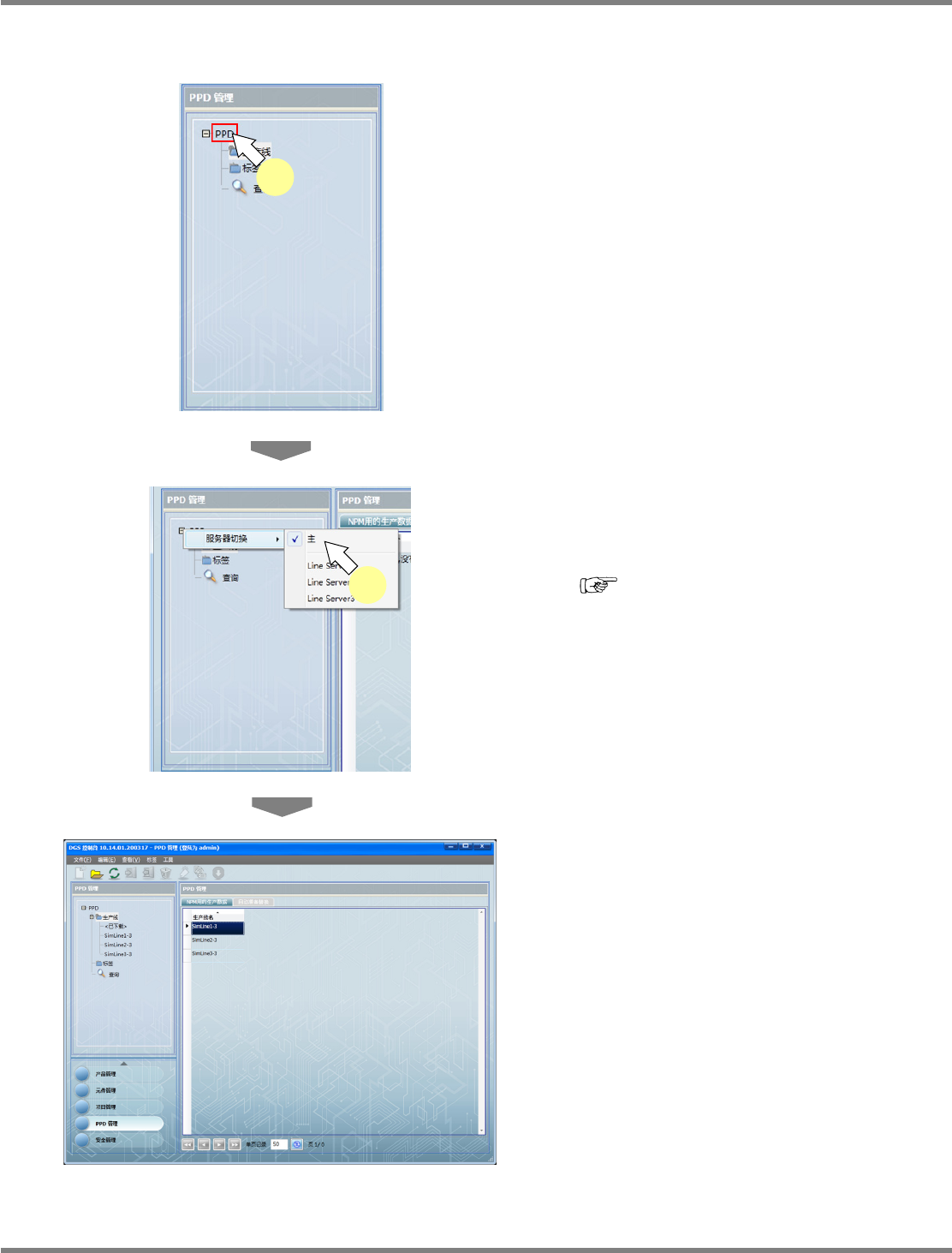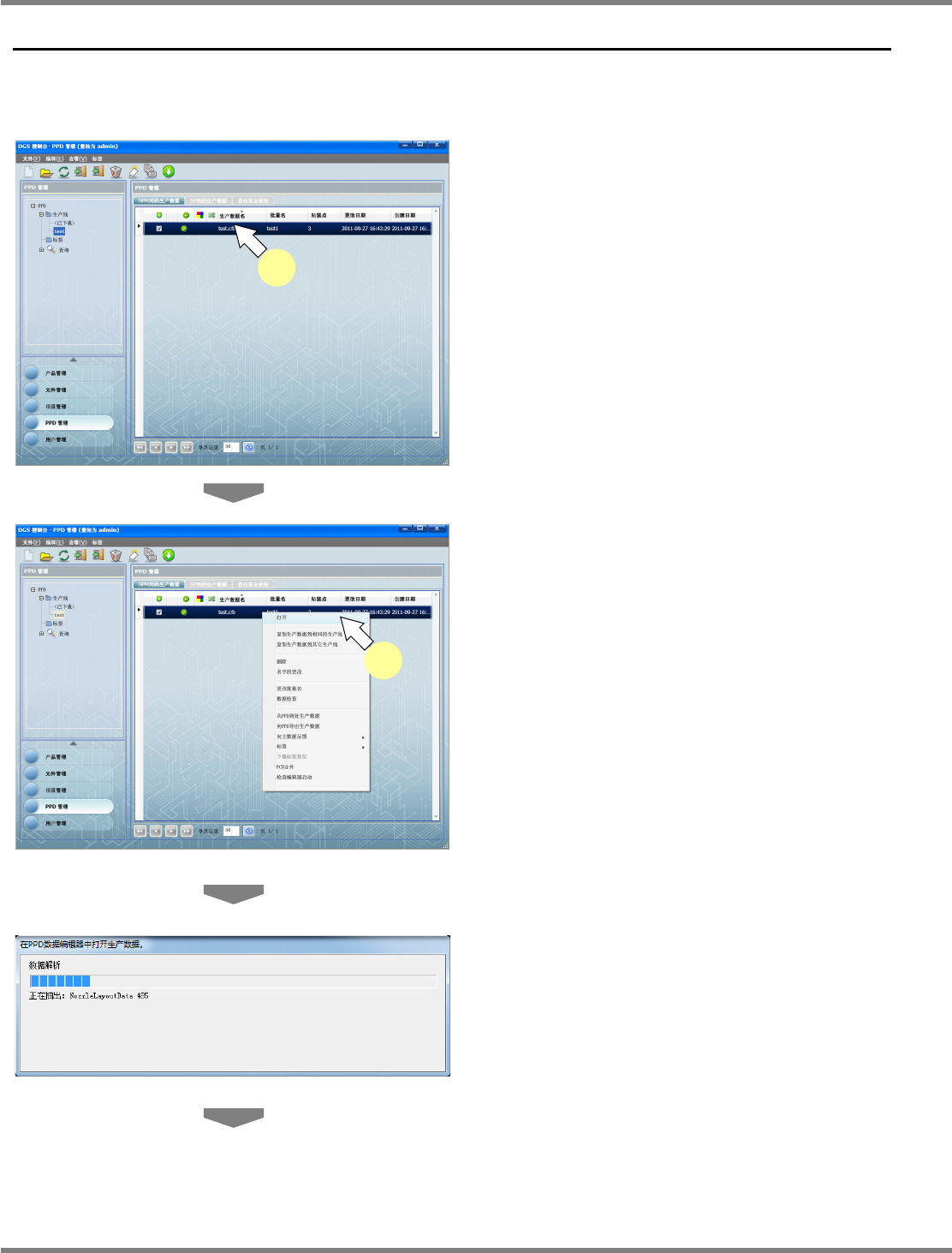 NPM-DGS 程序手册 9.3 生产数据的操作 Page 9-24 EJS9AC-MB-09P-24 9.3 生产数据的操作 9.3.1 项目编辑系统的启动 1 选择要编辑的生产数据。 2 选择菜单栏的 [ 文件 ] [ 打开 ] ,或者选 择右击菜单的 [ 打开 ] ,或者双击要选择 的生产数据。 打开下载的数据,将会显示 <LWS 数据管理项 目 > 画面。 打开没有下载的数据,将会显示 <PPD 数…