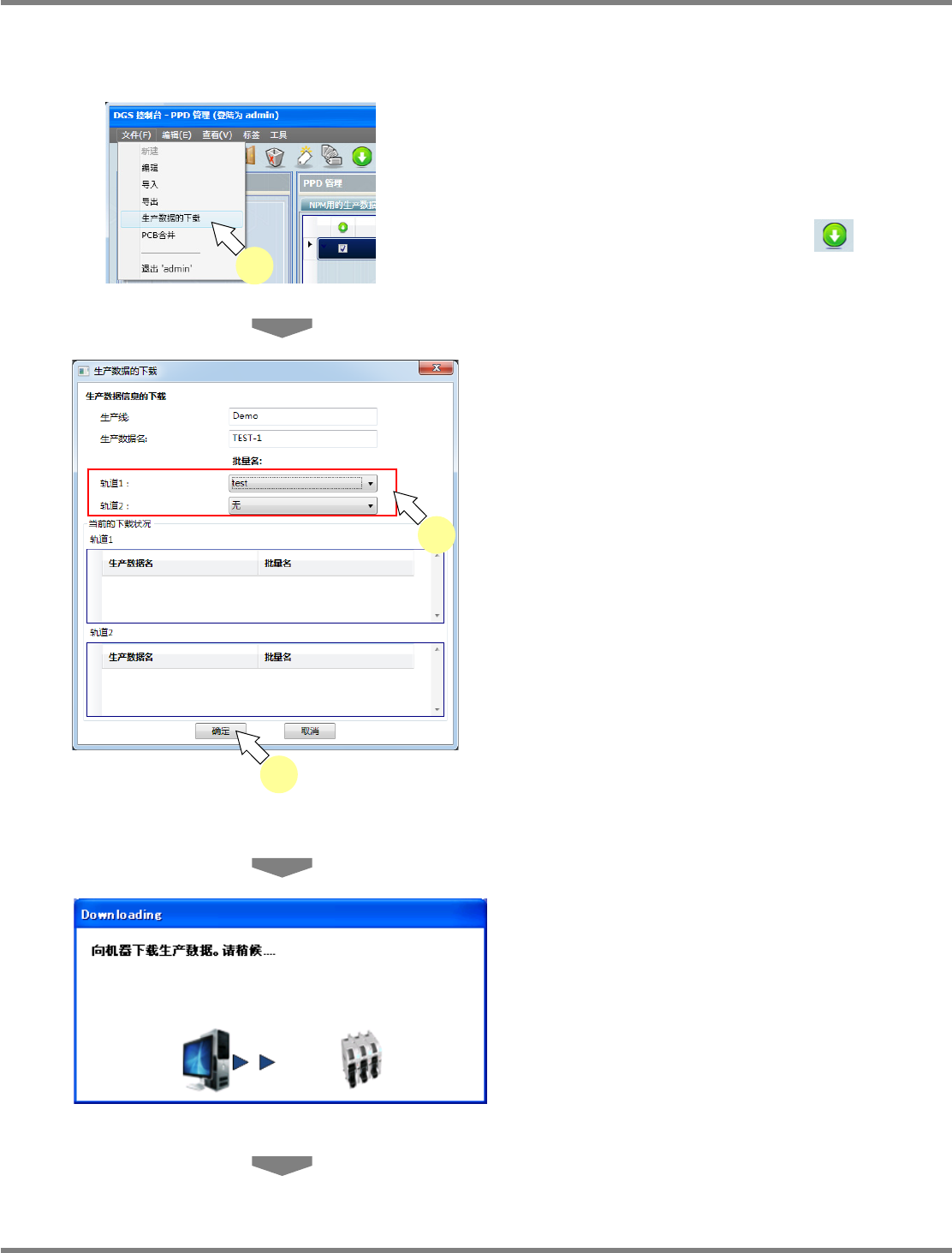 NPM-DGS 程序手册 9.3 生产数据的操作 Page 9-34 EJS9AC-MB-09P-24 5 点击 [OK] 。 生产数据下载到设备上。 以红色显示所下载的生产数据。 生产数据的下载 显示项目 项目 说明 ‘ 生产数据信息的下载 ’ ‘ 生产线 ’ 显示执行下载的生产线名称。 ‘ 生产数据名 ’ 显示执行下载的生产线数据名称。 ‘[ 轨道 1]’ 选择在轨道 1 执行下载的批量名。 ‘[ 轨道 2]’ 选择…