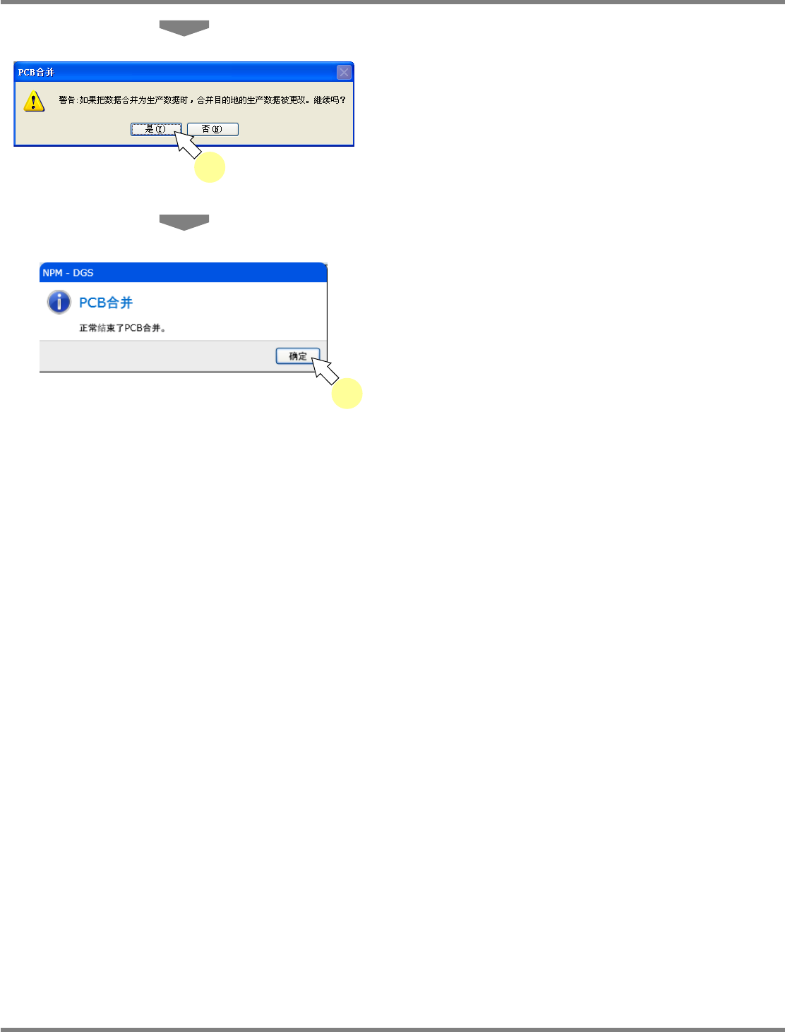 NPM-DGS 程序手册 9.3 生产数据的操作 Page 9-36 EJS9AC-MB-09P-24 5 点击 [ 是 ] 。 6 点击 [ 确定 ] 。 合并源的坐标 (X 、 Y 、角度 ) 即会被复制进合并 目的地数据内。 PPD090304S-06C 02 6 PPD090304S-05C 01 5