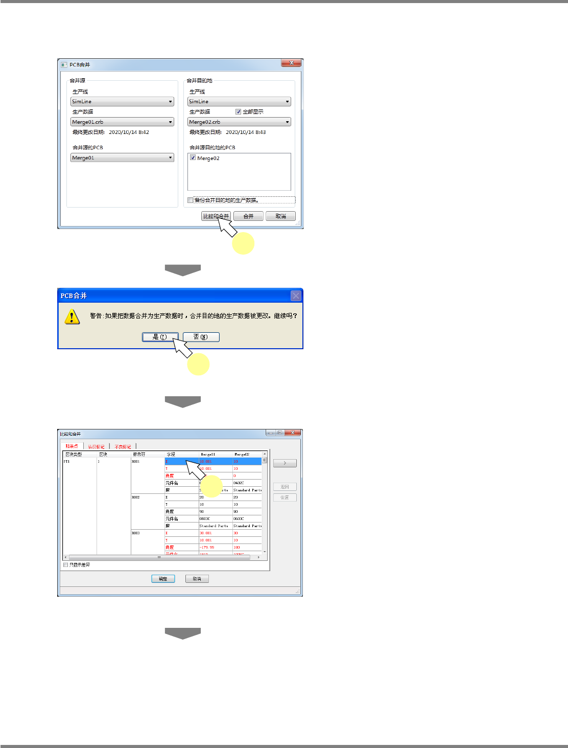 对每个贴装点都进行比较,然后只对从比较结果中选择的差异执行合并时,进行如下所示的操作。