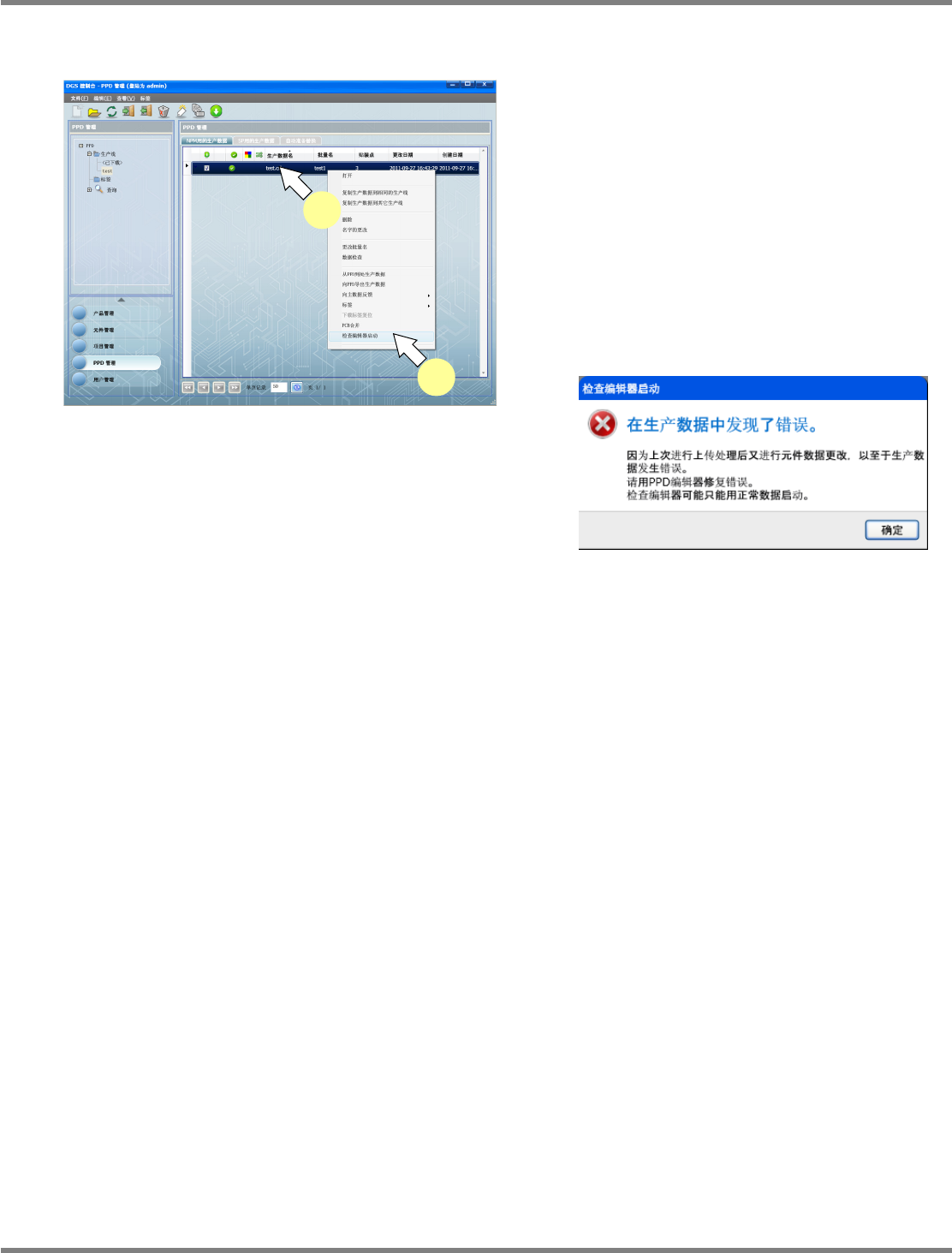 NPM-DGS 程序手册 9.3 生产数据的操作 EJS9AC-MB-09P-24 Page 9-43 9.3.7 检查编辑器的启动 1 选择要编辑的生产数据。 2 在所选的生产数据上右击弹出菜单, 选 择 [ 检查编辑器启动 ] 。 显示出 < 检查编辑器 > 画面。 检查编辑器可在没有数据检查错误时 启动。如 果存在错误,将显示下述的警告信息 。请通过 PPD 编辑器进行修复,并在承诺后重新 启动检 查编辑器。 …