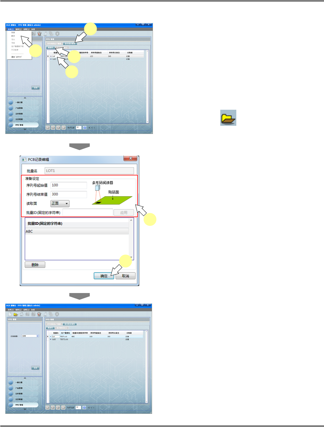 NPM-DGS 程序手册 9.3 生产数据的操作 EJS9AC-MB-09P-24 Page 9-51 6 点击 [ 确定 ] 。 在自动准备一览表中显示出被添加的 信息。 点击 [ 确定 ] 后,有时会显示如下所示的对话框。 这时, 表示相同 PCB 编码即已用于其他批量名。 允许将相同 PCB 编码用于不同批量名时, 请点 击 [ 确定 ] 。 注意事项 如果针对相同设备、轨道,对多个批 量名设定 了相同的 PCB 信息…