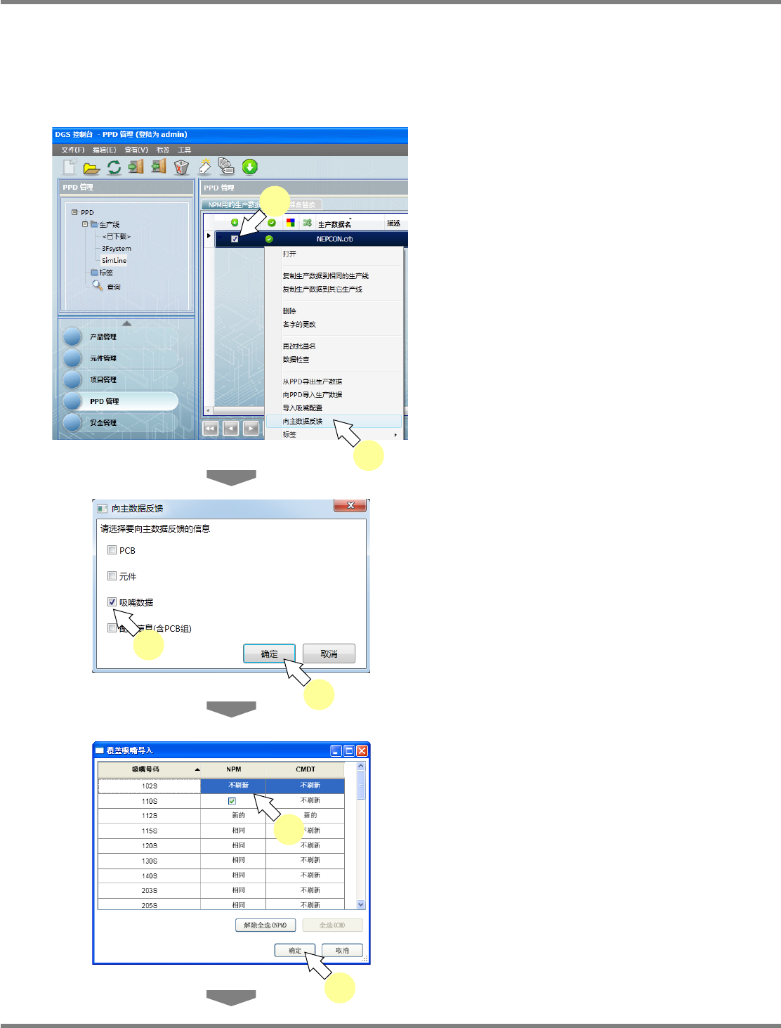 NPM-DGS 程序手册 9.3 生产数据的操作 EJS9AC-MB-09P-24 Page 9-61 9.3.12 向主数据库的反馈 将 PPD 中拥有实绩的数据反映进主数据 库, 需要导入实绩数据。 在这里, 对向主数据库反映 PCB 数据、元件数据的方法进行说明。 反映进吸嘴数据库 1 选择需要导入吸嘴数据的生产数据。 2 在所选择的生产数据上右击, 从右击菜 单中选择 [ 向主数据反馈 ] 。 显示出 < 向主数据…