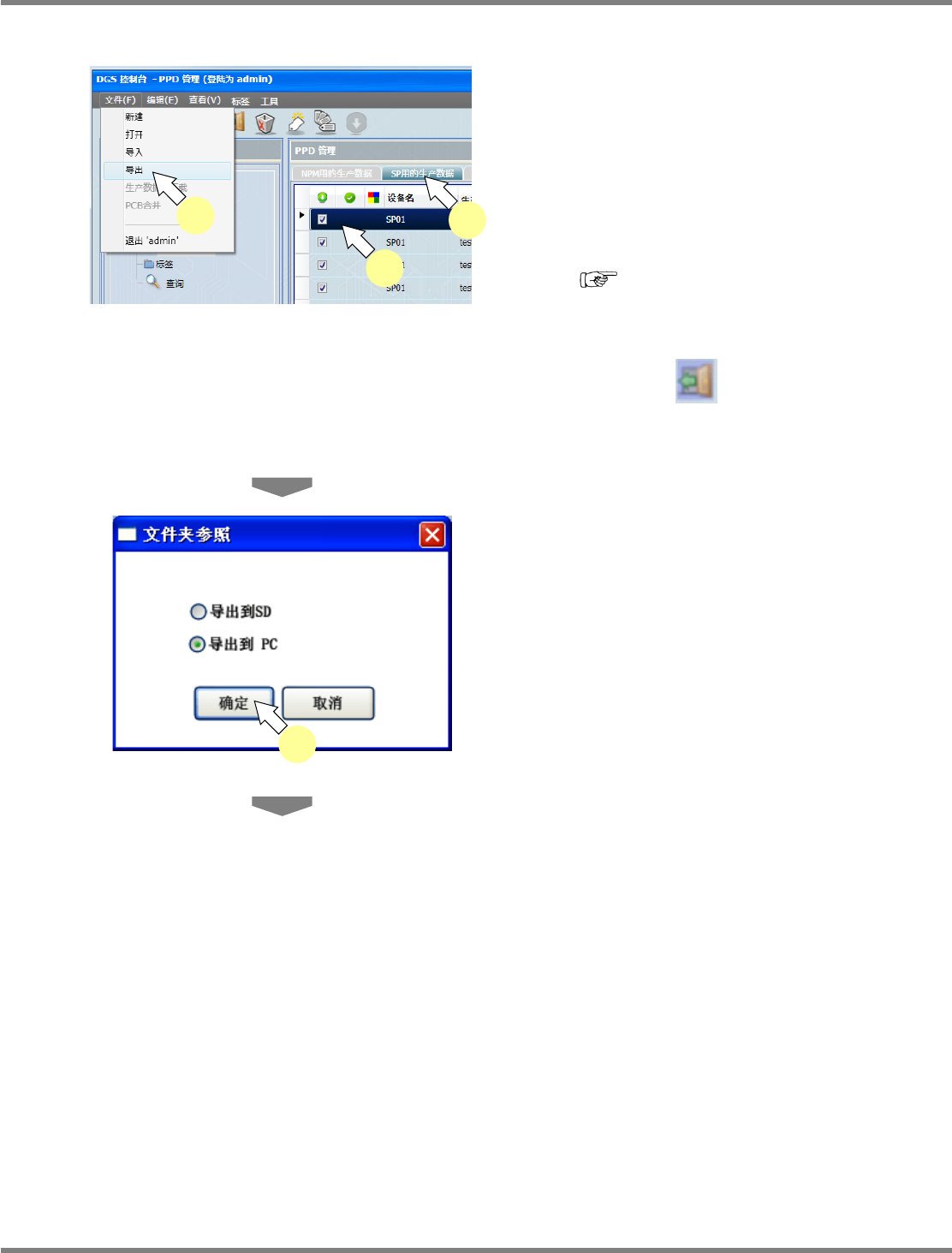 NPM-DGS 程序手册 9.3 生产数据的操作 EJS9AC-MB-09P-24 Page 9-77 S P 生产数据的导出 1 点击 [SP 用生产数据 ] 标签。 2 从一览中选择执行导出的 SP 生产数 据。 如果选择了快捷方式数据,所链接 的 SP 生产 数据即为导出对象。 ‘ SP 生产数据的快捷键 ’ 3 选择菜单的 [ 文件 ] [ 导出 ] ,或者点击 工具栏的 ( 导出 ) ,或者从右击菜 单中选择 …