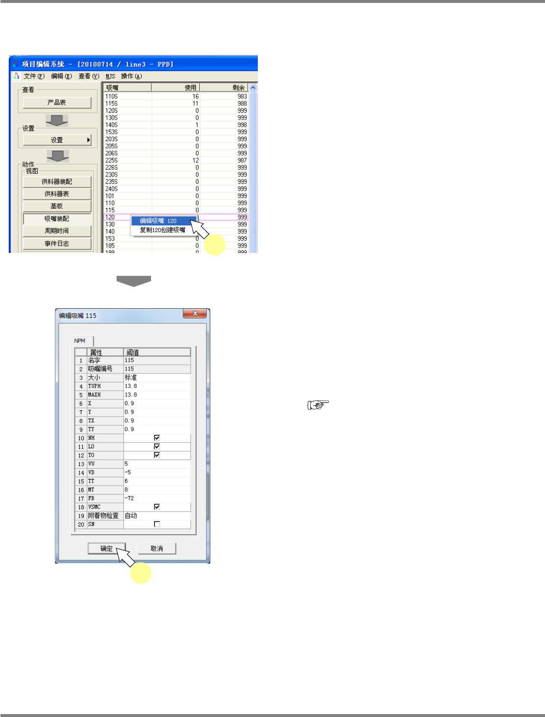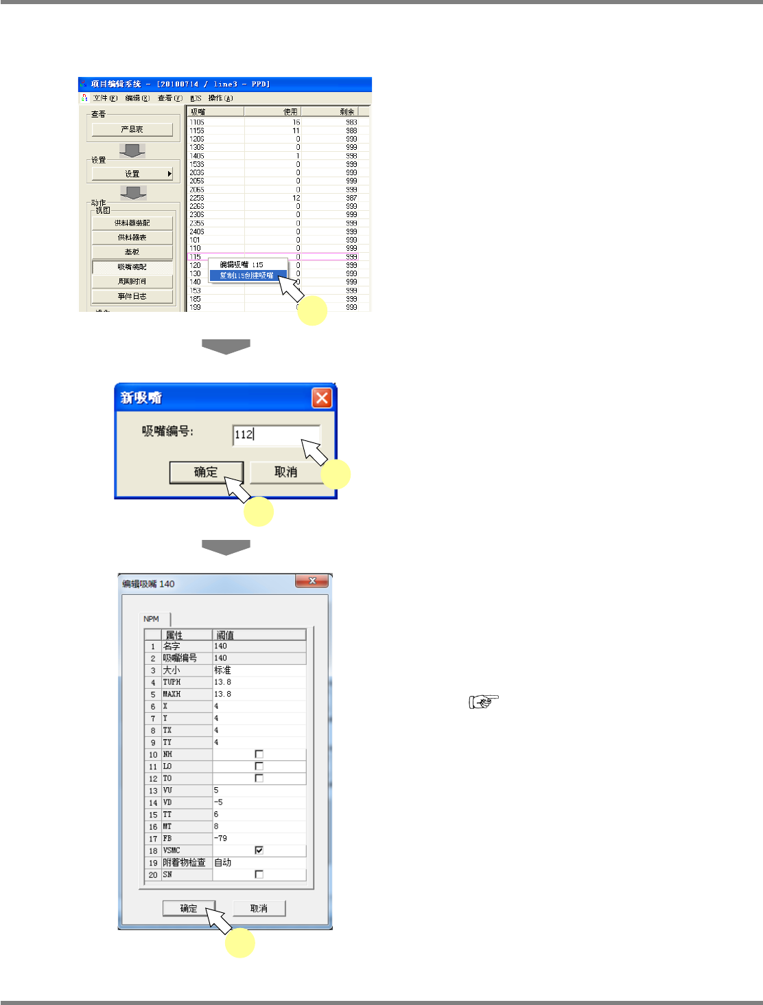NPM-DGS 程序手册 9.4 关于项目编辑系统画面 EJS9AC-MB-09P-24 Page 9-107 创建吸嘴数据 复制吸嘴列表中的既存吸嘴后,创建 新的吸嘴。 1 右击需要复制的吸嘴后,选择 [ 复制创 建吸嘴 ] 。 2 输入创建吸嘴的编号后,点击 [ 确定 ] 。 3 输入吸嘴数据后,点击 [ 确定 ] 。 关于各项目的详细,请参照 ‘4.4.3 吸嘴数据 ’ 。 需要编辑的吸嘴数据,将会保存进打 开的生产 …