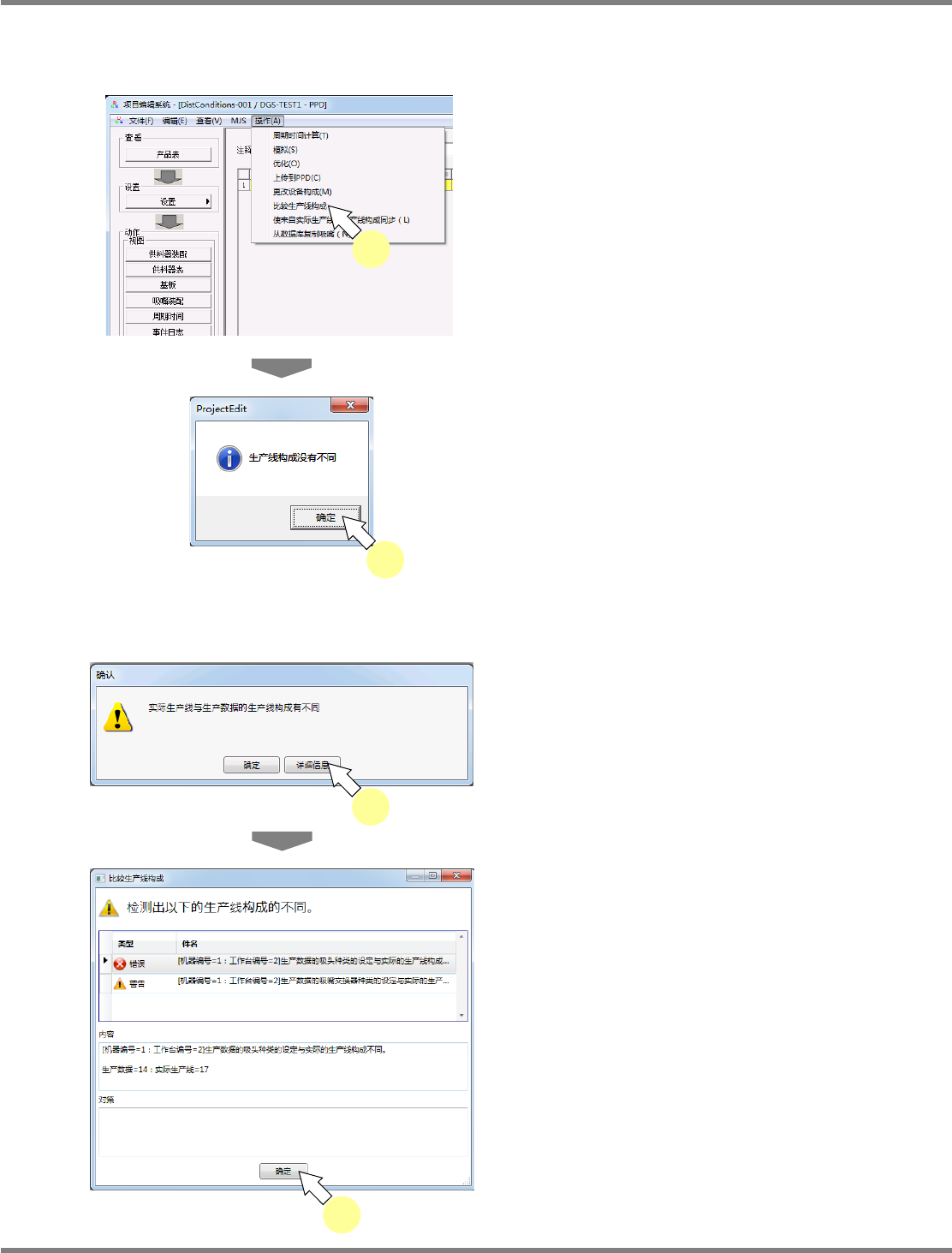 NPM-DGS 程序手册 9.6 生成数据 EJS9AC-MB-09P-24 Page 9-133 9.6.7 比较生产线构成 可对当前打开中的生产数据与实际生 产线的构成进行比较。 1 选择菜单栏的 [ 操作 ] [ 比较生产线构 成 ] 。 当实际生产线与生产数据的生产线构 成存在不 同时,将显示如所左所示的画面。当 生产线构 成不同时,请参照后述的 ‘ 生产线构成不同 时 ’ 。 2 点击 [ 确定 ] 。 将返回…