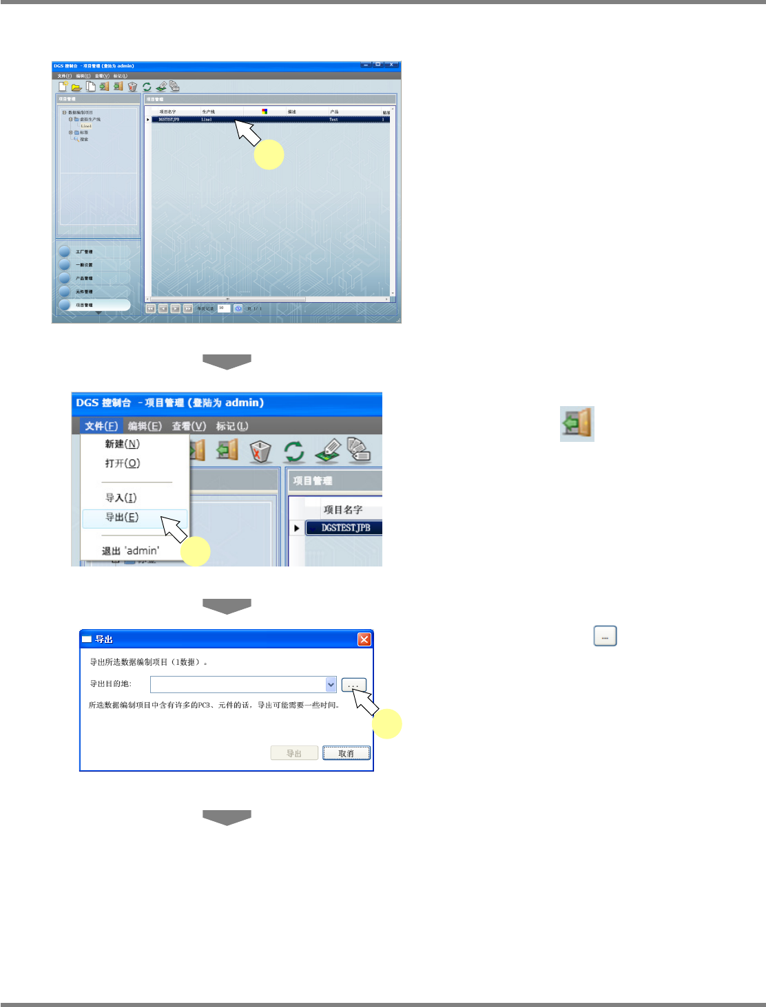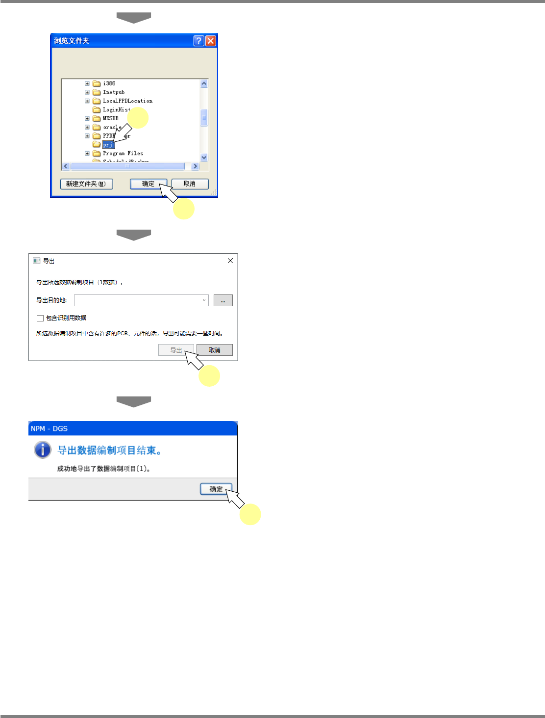 NPM-DGS 程序手册 7.1 概要 Page 7-22 EJS9AC-MB-07P-35 4 指定导出的文件夹后,点击 [ 确定 ] 。 将显示所选择的文件夹。 5 点击 [ 导出 ] 。 将显示导出的结果。 还需要导出识别用数据 ( P R U ) 时, 请勾选 ‘ 包含 识别数据 ’ 。 6 点击 [ 确定 ] 。 将保存数据编制文件 (.prj) 。 Product070105S- 04C00 4 4 Prod…