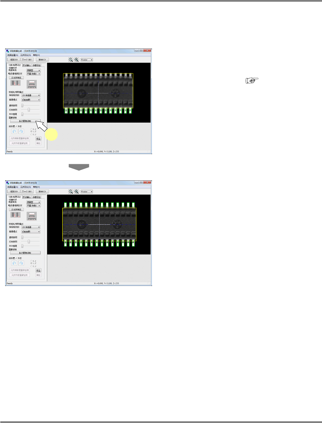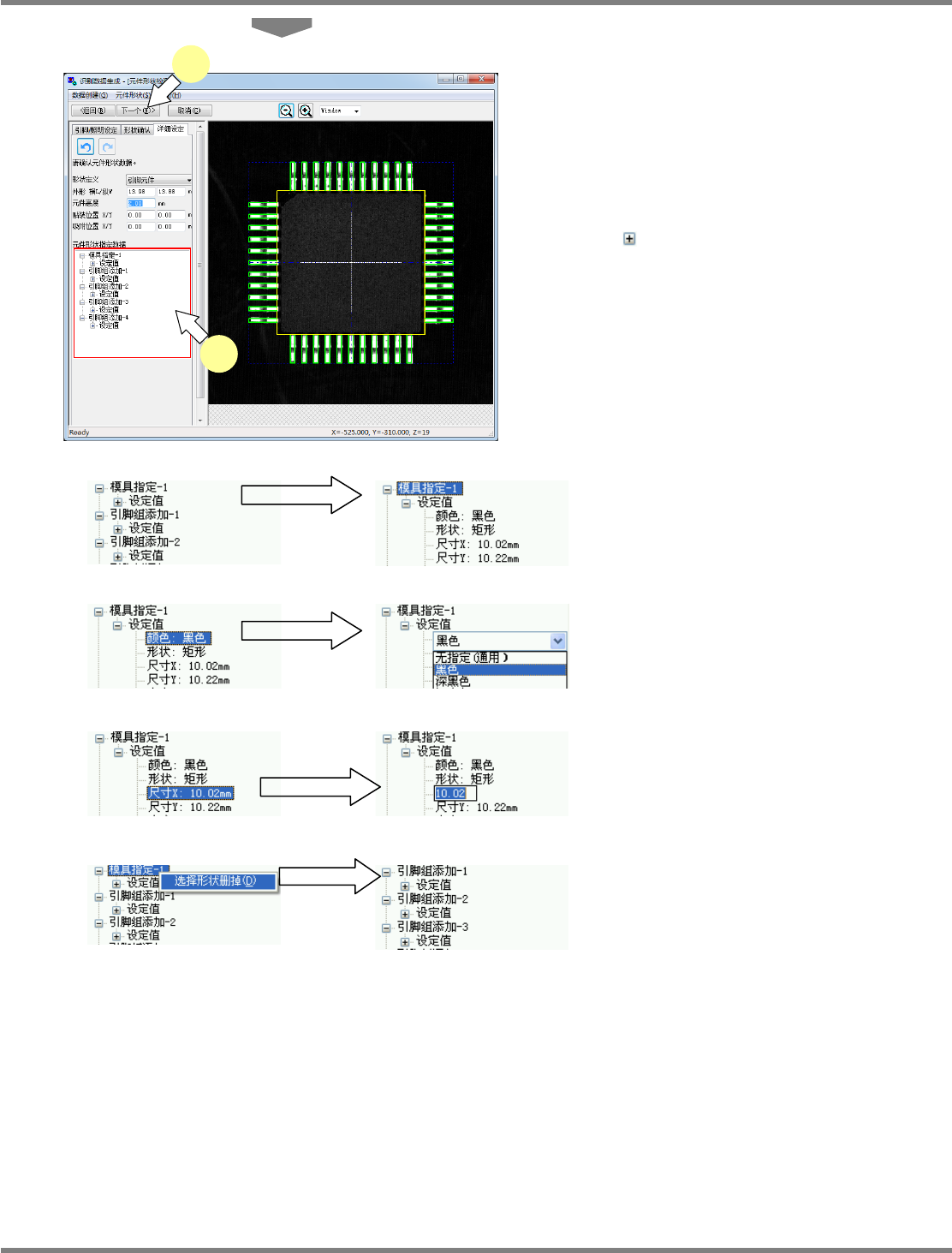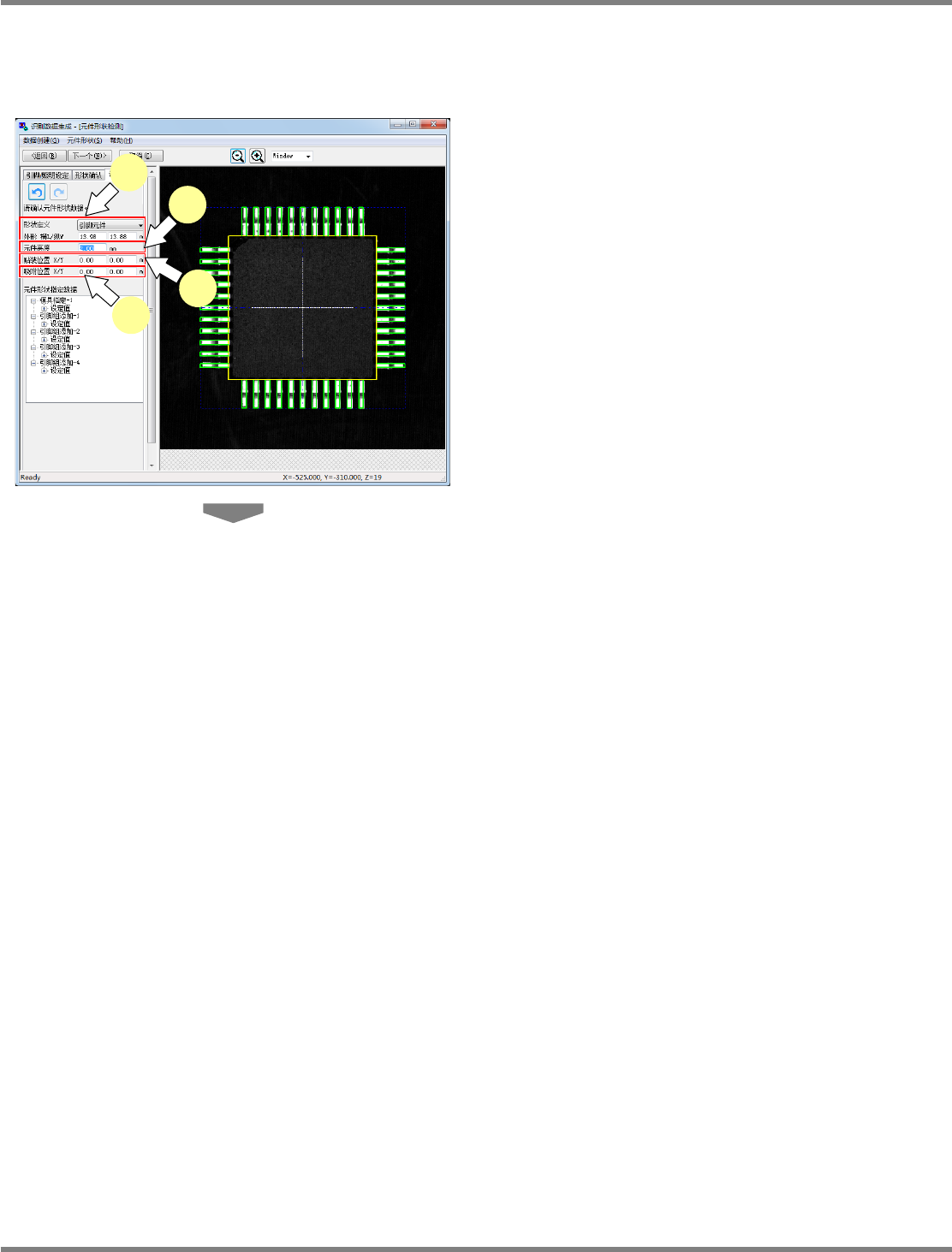 NPM-DGS 程序手册 11.4 用扫描设备制作识别选项数据的详情 EJS9AC-MB-11P-11 Page 11-23 5 确认元件形状指定数据一览表。 用一览表形式显示所设定的元件形状 指定数据。 所设定的形状将在画面右处的元件图 像视图中 用黄色、绿色、紫色框线显示。 点击各选项名称, 使其变为可选状态后作为元件 图像视图对象的形状将被改为红色框 线。 点击 ,则可确认设定内容。 选择了各设定内容后再次点击, 即能够在组合框 …