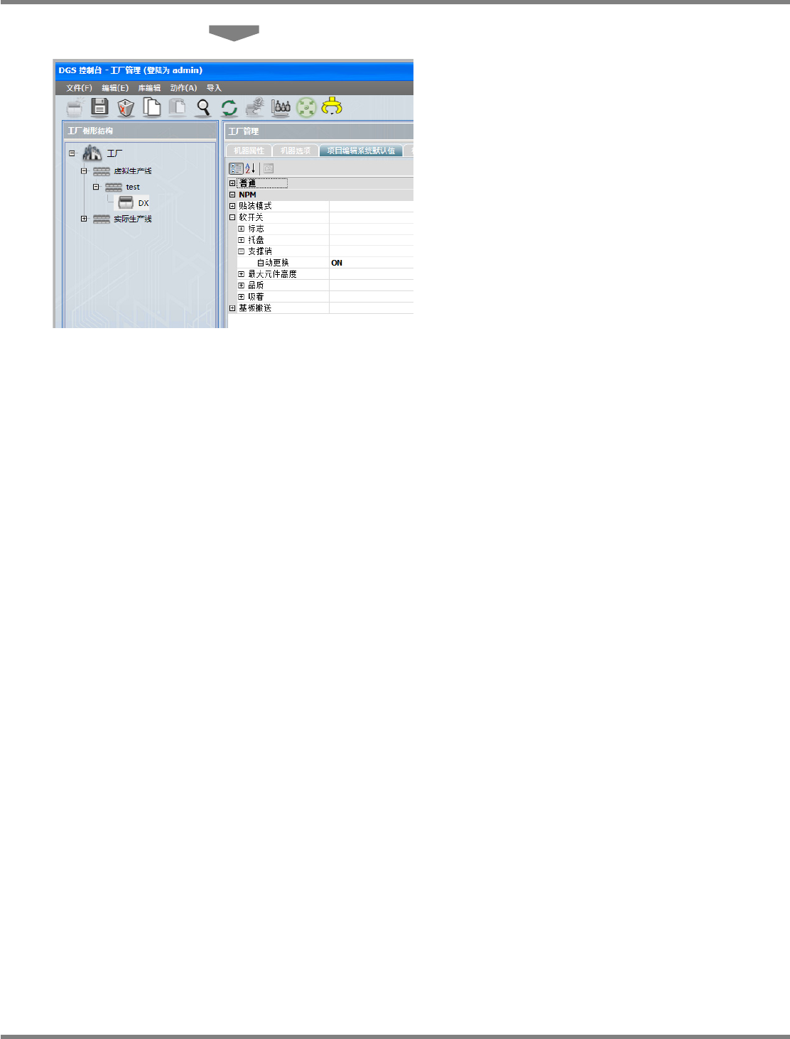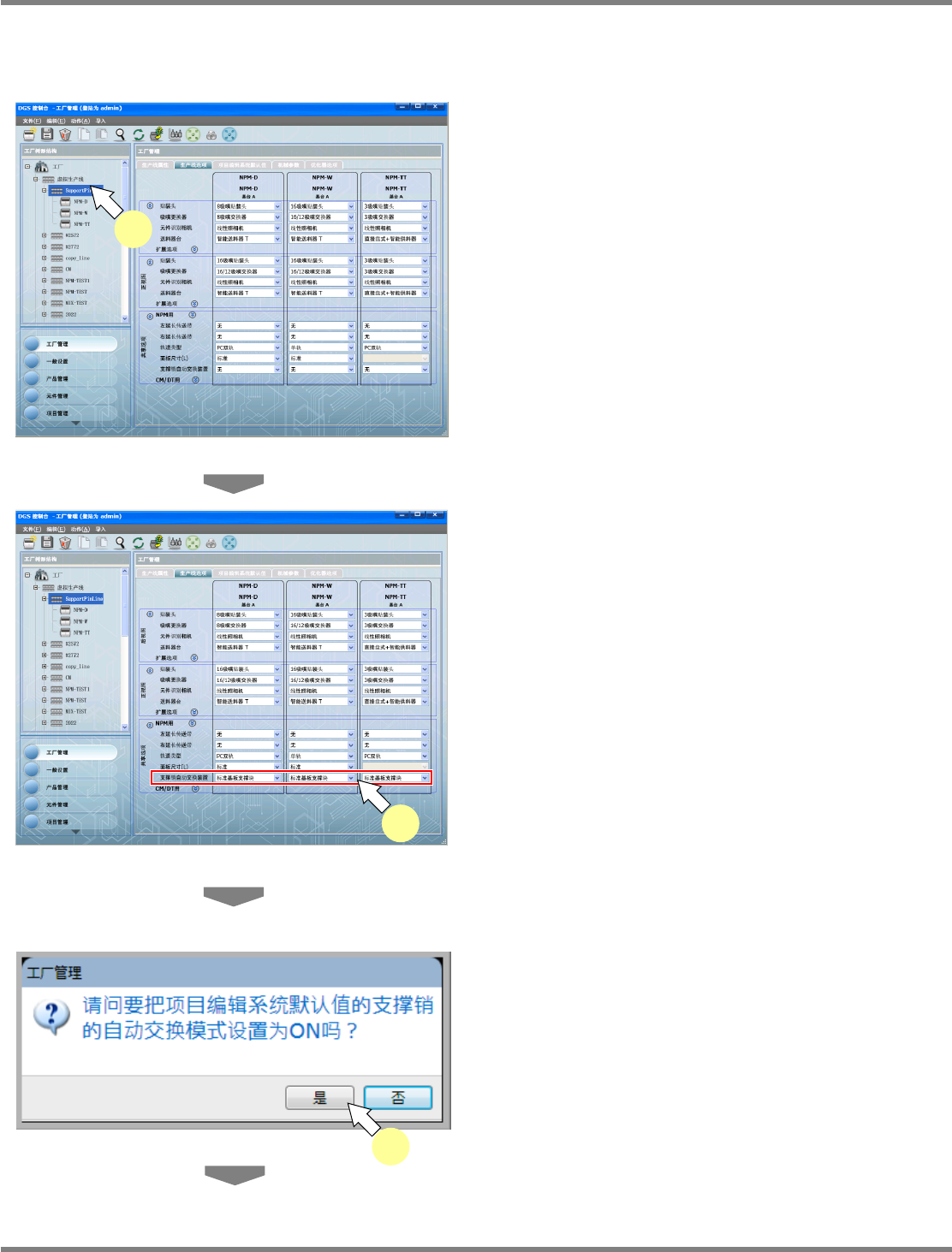 NPM-DGS 程序手册 13.2 支撑销配置数据的编制功能 Page 13-16 EJS9AC-MB-13P-30 13.2.4 设定生产线构成 进行支撑销的自动更换,需要使对象 设备的选购件转为有效。 1 打开工厂管理的生产线。 2 将设备共通选项中的 ‘ 支撑销自动交换 装置 ’ 设定为 ‘ 标准基板支撑块 ’ 。 只有在安装了支撑销自动交换装置的 设备上, 才可设定共通选购件的 ‘ 支撑销自动交换装 置 ’ 。 3 在变更确…