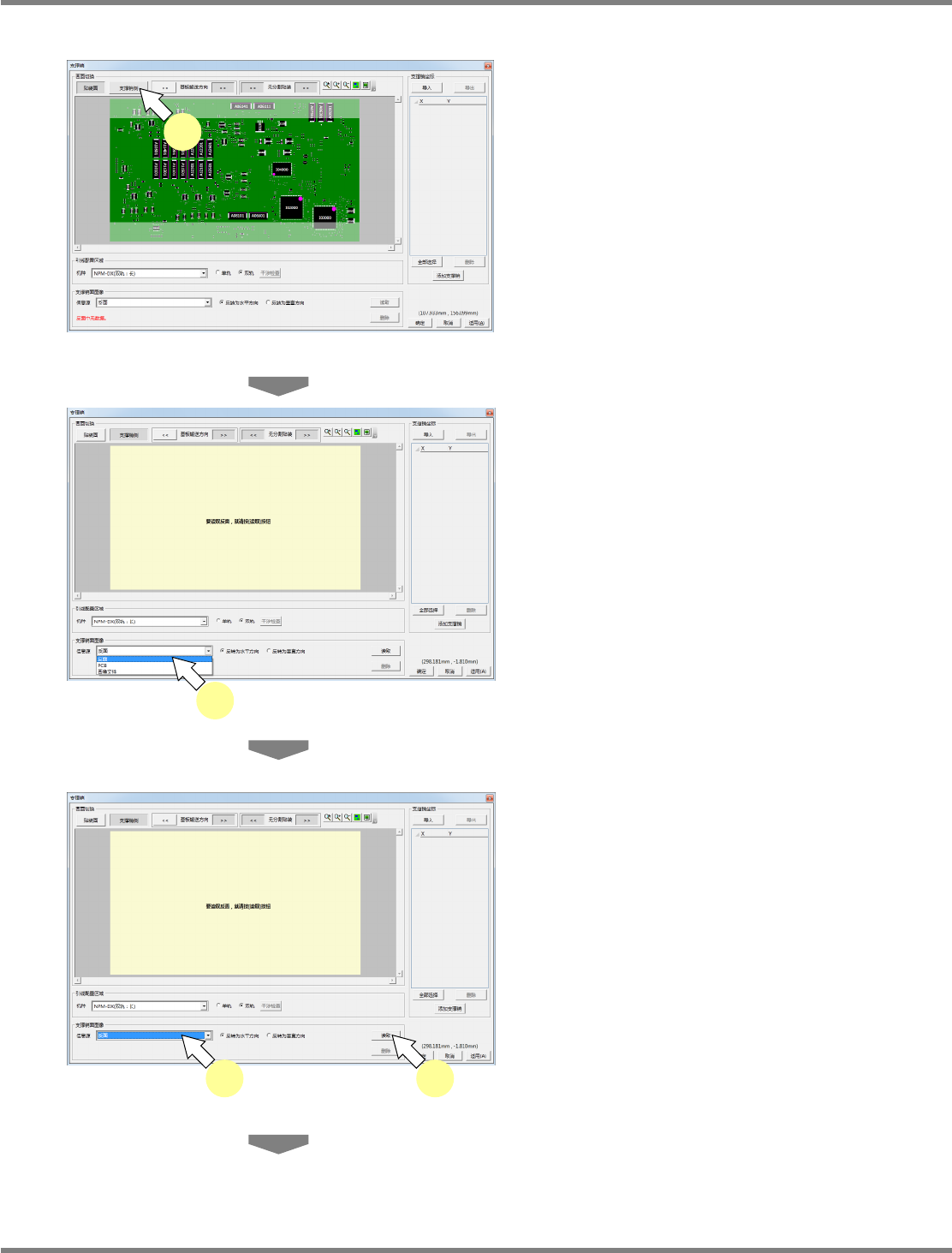 NPM-DGS 程序手册 13.2 支撑销配置数据的编制功能 Page 13-30 EJS9AC-MB-13P-30 反面图像的读取 以反面读取支撑销侧图像的流程 已经通过其他步骤设定完毕, 或者变更既存支撑 销图像文件时,需要在选择信息源之 前删除图 像。 ‘ 通过图像文件读取支撑销侧图像 ④ 支 撑销侧图像的删除 ’ 在读取源上指定反面。 指定反面后对反面进行编 辑时, 将自动反映进支撑销图像, 因此无需再进 行设定。 不具…