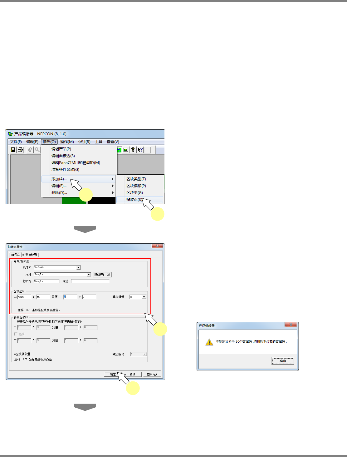 在元件编辑器下添加已设定了支撑销的贴装点时,将以这个元件的支撑销坐标执行添加。这时的限