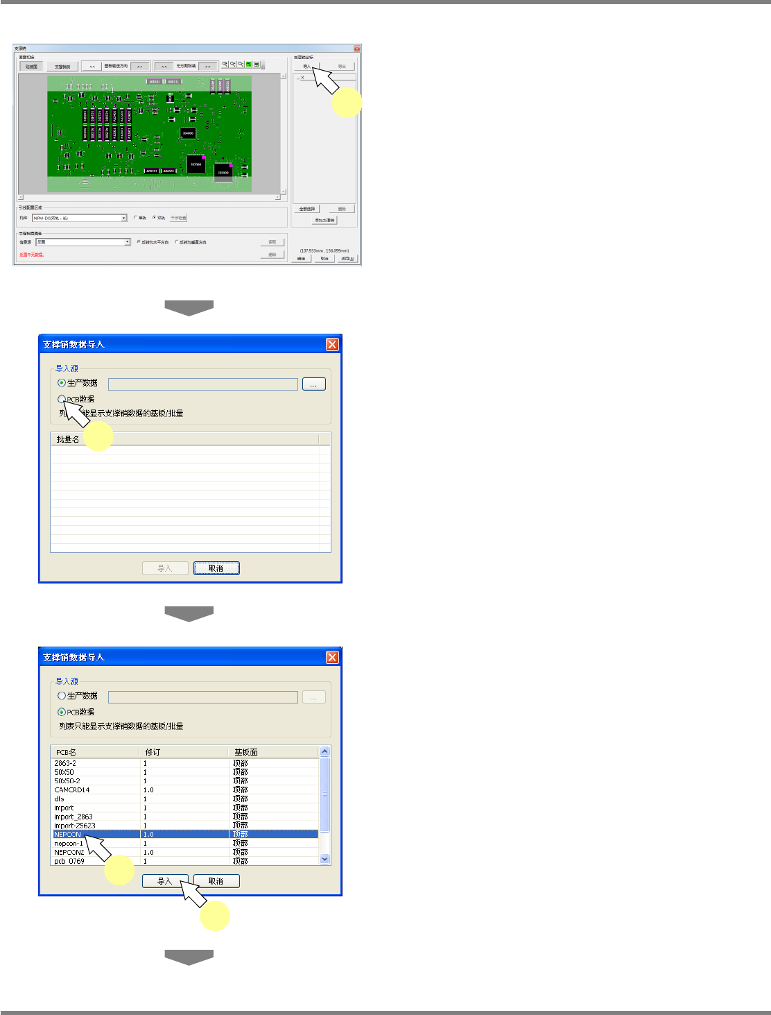 NPM-DGS 程序手册 13.2 支撑销配置数据的编制功能 EJS9AC-MB-13P-30 Page 13-61 5 替换支撑销的坐标时,点击 [ 是 ] 。 6 将会显示导入结束的信息, 点击 [ 确定 ] 。 导入后的支撑销数据,将会显示在基 板上以及 支撑销坐标一览中。 当使用以往版本的数据时,有时坐标 数据会被 修改。 导入后,请确认是否会发生干涉。 Howto130205S-2 4C02 Howto130205S-…