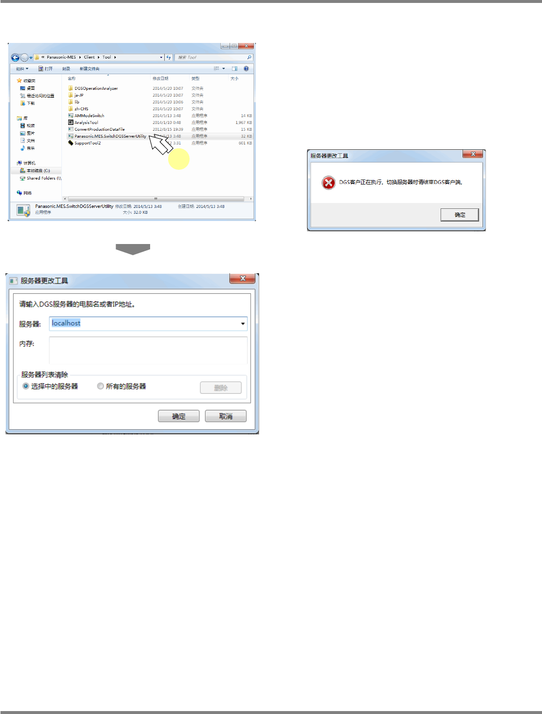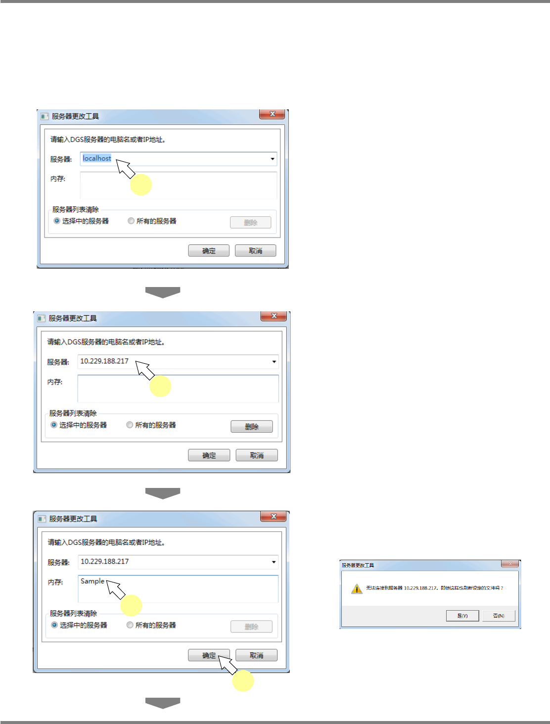 NPM-DGS 程序手册 13.7 服务器更改工具 EJS9AC-MB-13P-30 Page 13-121 13.7.3 连接处服务器的更改 执行更改的连接处服务器,除了输 入 IP 地址或电脑名以外,还可从以往更改 过的服务器列表中选 择。 输入服务器/计算机名后更改时 1 选择服务器。 启动时,默认显示启动源电脑名或上 一次更改 时的服务器名。 2 输入 IP 地址或电脑名。 3 输入注释。 请以任意文字输入与连接处服…