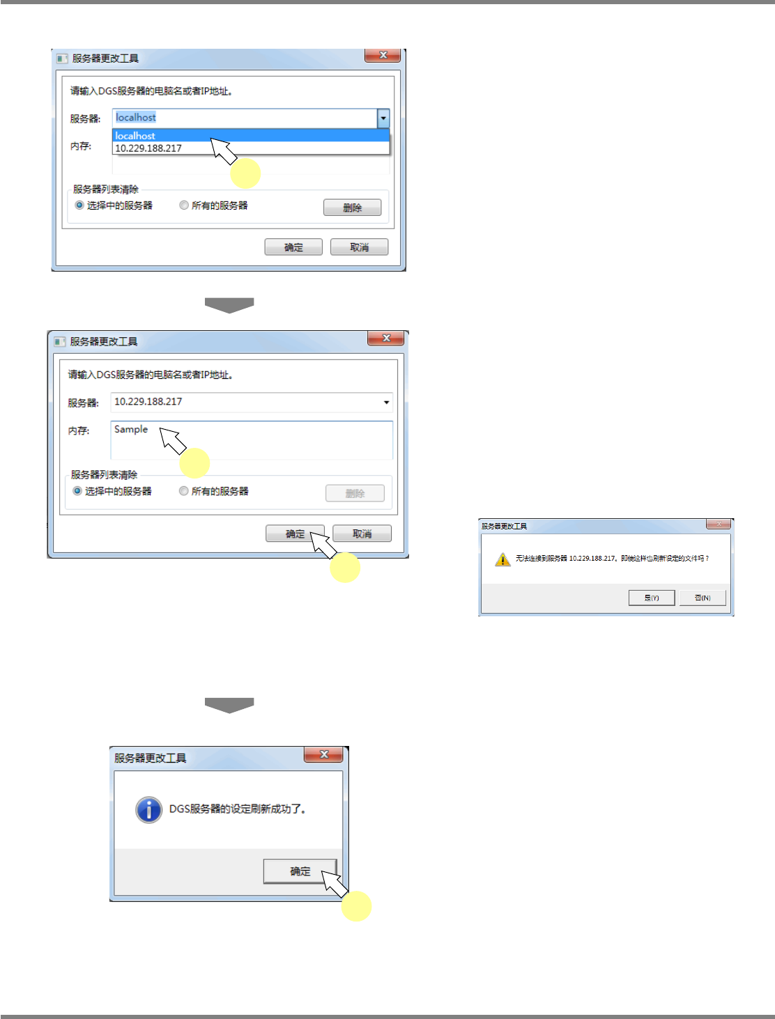 NPM-DGS 程序手册 13.7 服务器更改工具 Page 13-124 EJS9AC-MB-13P-30 13.7.4 服务器列表的删除 在这项功能下,可从历史中删除不再 使用的连接服务器。 删除选择的服务器 1 从下拉菜单中选择想要删除的服务器。 将显示以往更改过的服务器列表。 ( 最多 20 项 ) 2 选择 ‘ 选择中的服务器 ’ 或 ‘ 所有的服务 器 ’ 。 请确认以下事项后选择。 ‘ 选择中的服务器 ’: 只…