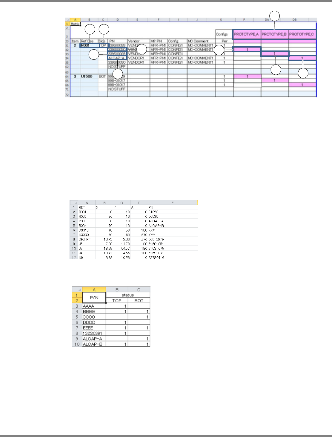 NPM-DGS 程序手册 13.11 试作基板数据的生成 EJS9AC-MB-13P-30 Page 13-133 Matrix 数据文件 Matrix 数据文件以如上所示的 Excel 文件为前提。 试作基板数据的生成功能,是在这 个 Matrix 数据基础上进行的以下操作 : ① 新建生成 PROTOTYPE_A_T 、 PROTOTYPE_B_T 、 PROTOTYPE_C_T 的试作基板数 据。 (‘T’ 表示在试作数据生成…