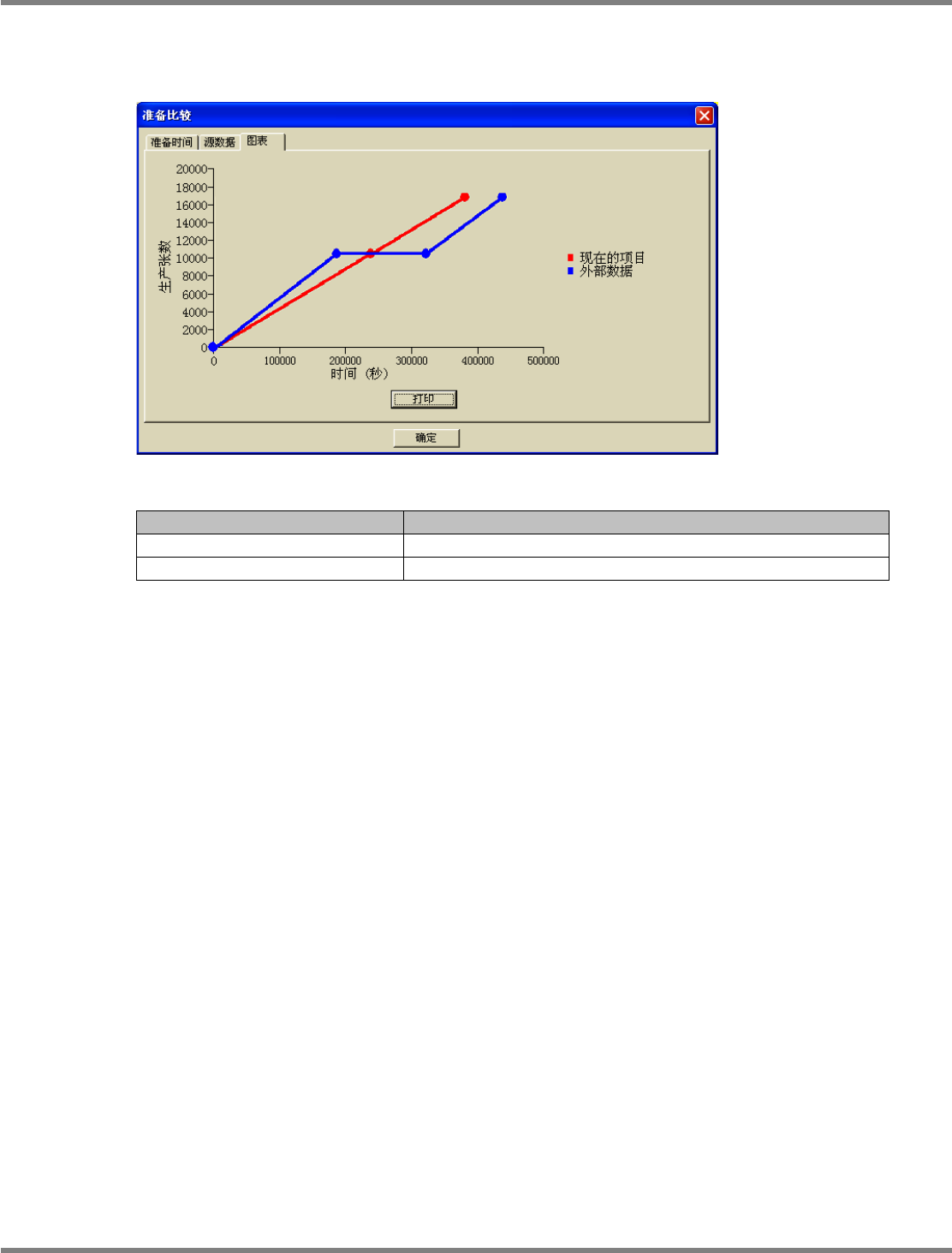 NPM-DGS 程序手册 7.2 项目编辑系统主画面 Page 7-48 EJS9AC-MB-07P-35 7.2.4 准备转换的比较 ( 图表 ) 显示以 X 轴为生产时间、以 Y 轴为生产张数的曲线图表,并将其 打印。 按钮 按钮 说明 [ 打印 ] 打印曲线图表。 [ 确定 ] 结束 < 准备比较 > 画面。 Product070204S- 01C01