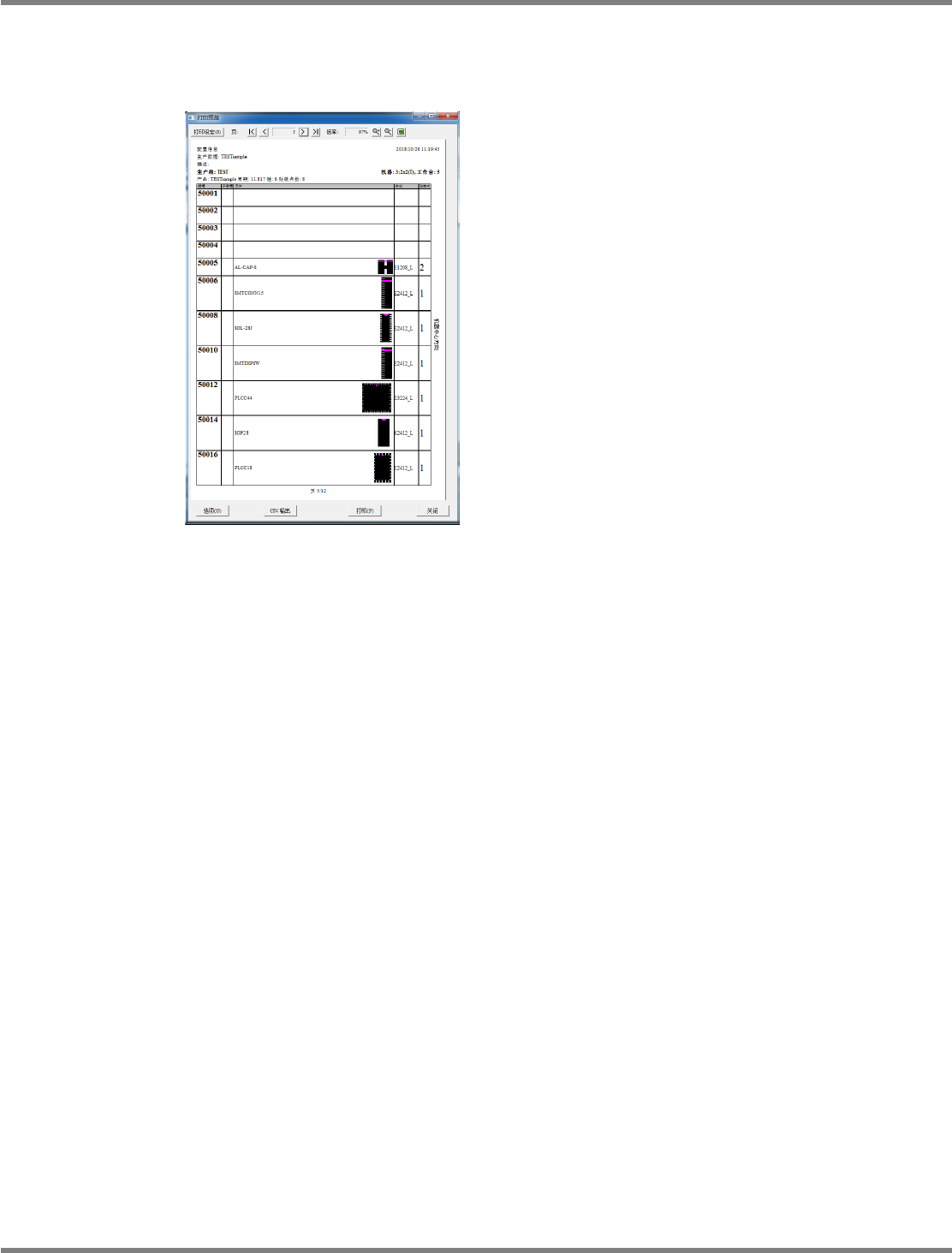 NPM-DGS 程序手册 7.2 项目编辑系统主画面 Page 7-56 EJS9AC-MB-07P-35 显示项目 项目 说明 ‘ 页 ’ 显示帐票的页码。 ‘ 倍率 ’ 显示打印预览的显示倍率。 ‘ 生产数据 ’ 显示制作数据的项目名称。 ‘ 描述 ’ 显示 PCB 列表画面的描述。 ‘ 生产线 ’ 显示生产线名称。 ‘ 机器 ’ 显示设备编号和设备名称。 供料器配置信息 ‘ 工作台 ’ 显示工作台编号。 ‘ 产品 ’ 显示 P…