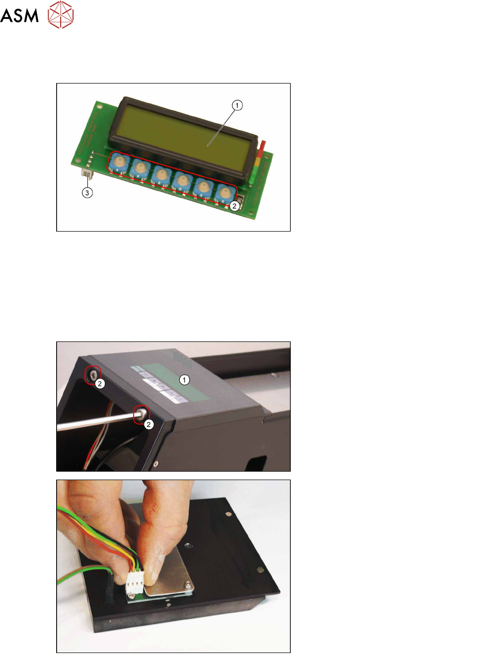4 Servicearbeiten 4.2 Ersatzteiltausch 32 Serviceanleitung SIPLACE LDU-X Linear Dipping Unit 11/2017 4.2.11 Displayplatine austauschen Übersicht Displayplatine [03055413-xx] 1. Display 2. Schalter für die Folientastatur …