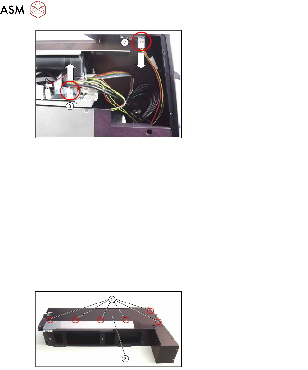 4 Servicearbeiten 4.2 Ersatzteiltausch 58 Serviceanleitung SIPLACE LDU-X Linear Dipping Unit 11/2017 Sicht von der linken Seite nach geöffneter Seitenabdeckung. ► Ziehen Sie den Stecker aus dem An- schluss an der Display…
