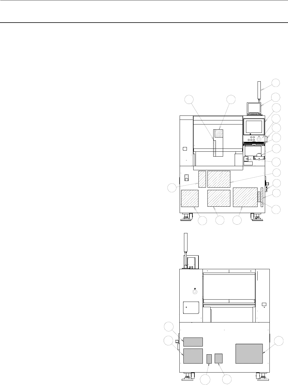 动作说明书 1-1 1 电气部 1-1 电气部的布局 1-1-1 各部的名称 1. 图像用监视器 2. 信号灯 3. LCD 监视器 4. HOD 5. 操作盘 〔前: LCD 监视器、 START 开关、 S T O P 开关、 ORIGIN 开关、紧急停止开关〕 〔后:紧急停止开关〕 6. 贴装头装置 〔贴装头主基板组、贴装头中转基板组、 Z / θ 轴伺服放大器、 HMS 〕 7. OCC 、垂直照明基板组 、 角度照明基板 8.…