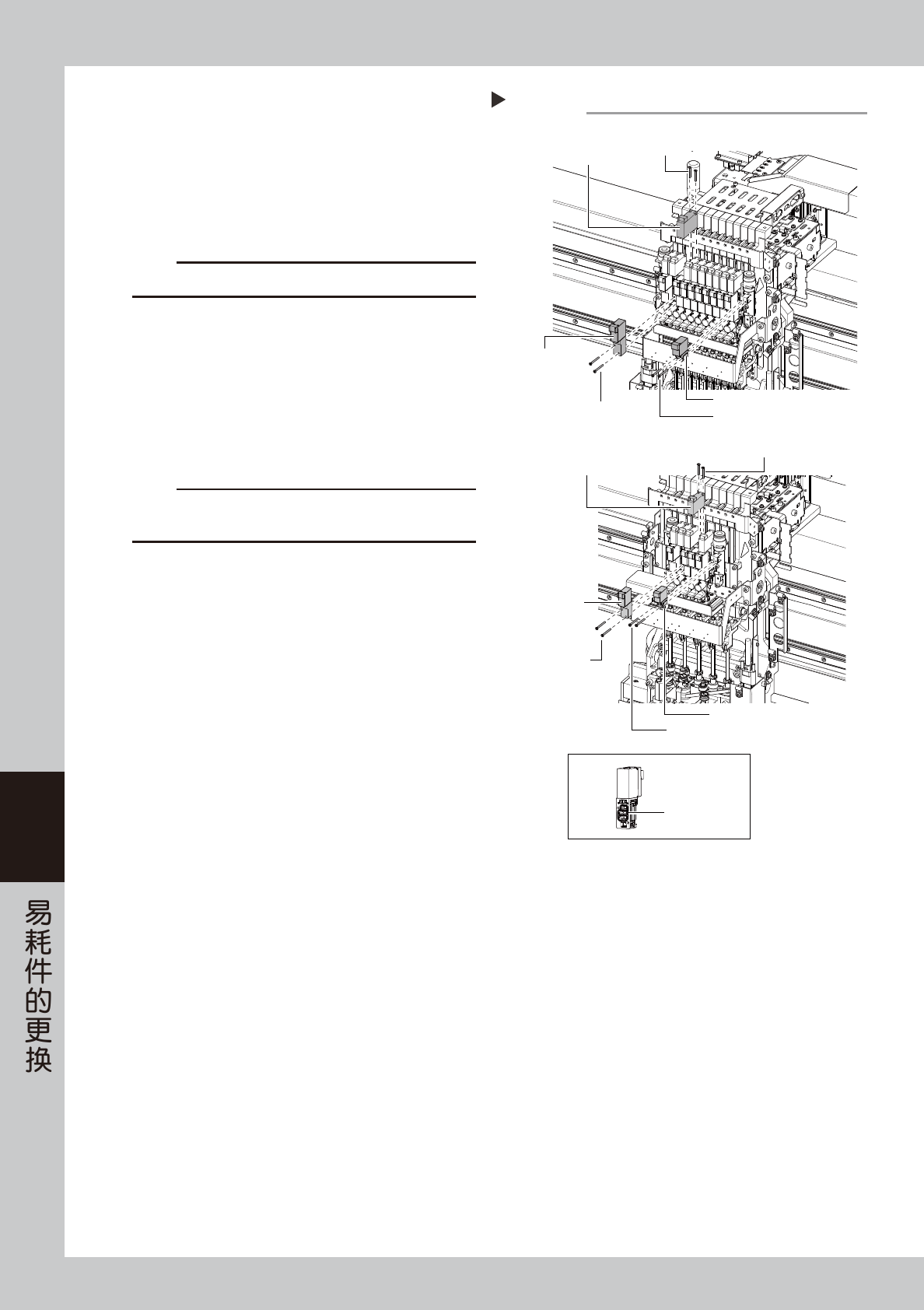 6-7 6 4. 传送带的更换 在前述第 3 章 “5.2传送带的点检与传送部的清洁”中, 检查出传送带有明显松弛、 脏污或起毛时, 需要更换传送带。 下面,介绍更换传送带的方法。 1 将传送宽度调到便于更换传送带的宽度。 1. 按“生产设计”画面的 [ 传送宽度 ] 按钮,打 开调节传送宽度的画面。 2. 在“调节后的传送宽度”输入框里输入可伸入 内六角扳手进行操作的宽度 (200mm 左右 ) 之 后,按 [OK] 按钮…