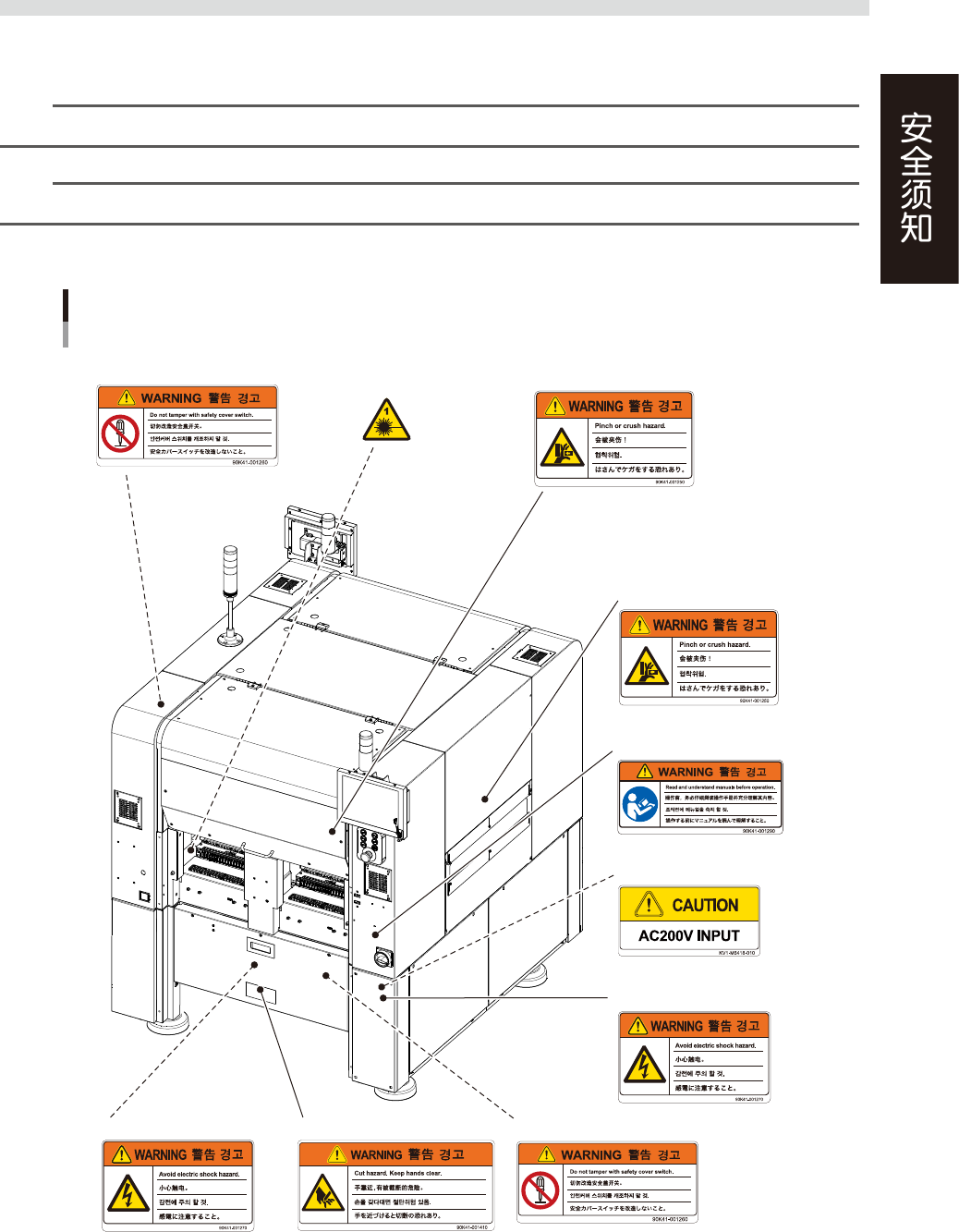 xxviii ■ 标贴张贴位置 警告标贴 背面 ■ 电路保护器盖板 ■ 切带器盖板 (前后) ■ 切带器盖板开关 (前后) ■ 机盖 (前后) ■ 传送轨开口部 (左右) ■ 机盖开关 (前后) ■ 变压器盖板 ■ 检查送料器翘起的传感器 (前后、左右) 95201-KMG-00