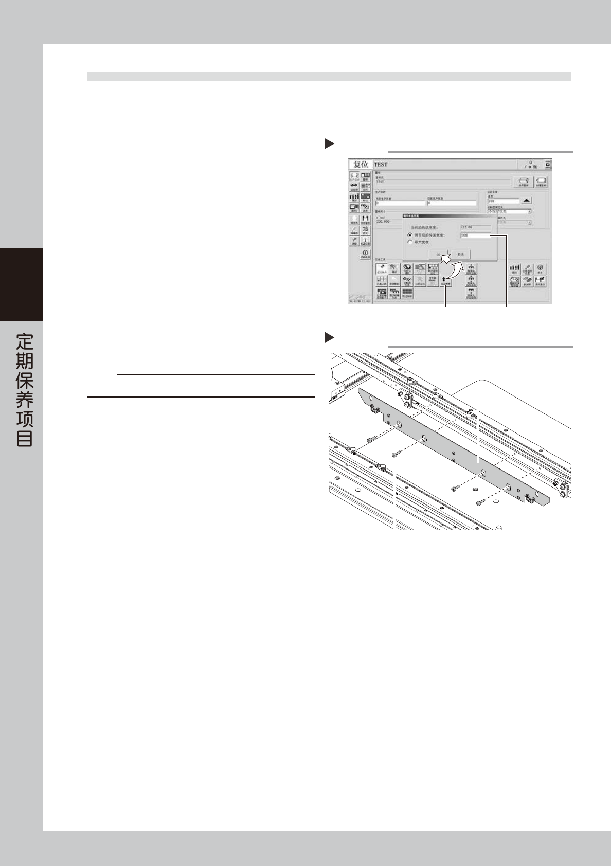 3-30 3 5.2 传送带的点检与传送部的清洁 传送带传送面被磨损可引起滑带, 导致无法稳定地传送基板。因此, 建议定期对传送带的磨损状态进行检查。此外, 由于传送带被磨损导致磨损粉在传送部传感器的受光面堆积,引起误感应基板,磨损粉在传送带导轨部或带轮表 面积存则可能引起传送带传送不动等故障发生。 1 将传送宽度调到便于更换传送带的宽度。 1. 按“生产设计”画面的 [ 传送宽度 ] 按钮,打 开调节传送宽度的画面。 2. 在“调节后…