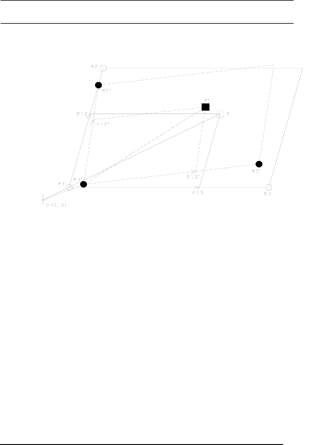 R e v 1 . 00c 动作说明书 3- 68 3-12-3 指定标记的修正方法 3 点的 BOC 标识时 ( 区域指定标记也一样 ) 上图的 ○ 显示的点 M1,M2,M3 是基板数据种的 BOC 标记坐标,经各个点的识别求得得实际坐标为 ● 显示的 M1、M2、M3 时,计算对应贴装数据上的贴装坐标 P 点 (□) 的实际贴装坐标 P 点 (■)。 此时, 基板也同样地移动、 变形的话, 让通过 M1,M2,M3 的 3…