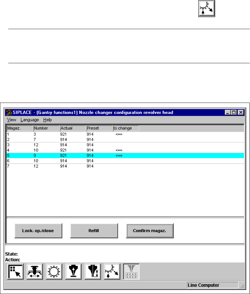 5 Single Functions User Manual SIPLACE S -23 HM 5.2 Single functions, Gantry Software Version SR.406.xx 02/00 US E dition 168 5.2.6 "Nozzle c hanger con figurati on revolv er head" scre en 5 Å In th e current s…