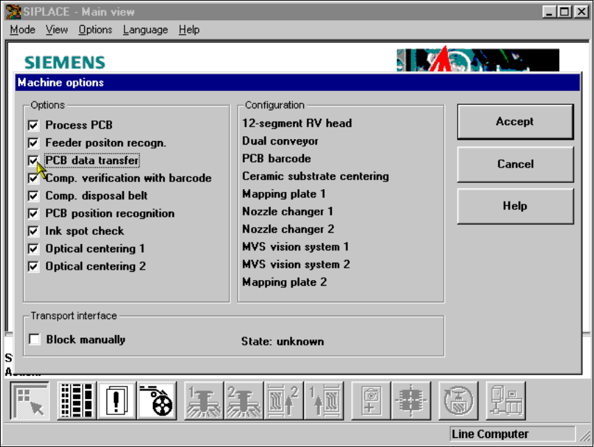 User Manual SIPLACE S-23 HM 11 Station extensions / hardware Software Version S R.406.xx 02/00 US Edition 11.7 PCB data transfer 413 Å Click o n the ’ Machine options’ but ton in t he basic view . The ’Mach ine optio ns’…